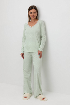 Легкий комплект для комфортного сна и отдыха набивного трикотажа с нежным рисунком из 100% натурального хлопка. Джемпер с V-образным вырезом, украшенный эластичным кружевом комфортно садится по фигуре.  Брюки с поясом на резинке и атласной лентой. Гладкий материал приятен к телу и позволяет коже дышать.