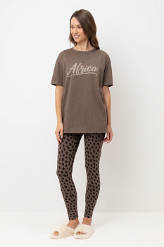 Комплект для сна и отдыха из меланжевого трикотажа. Удлиненная футболка комфортно садится по фигуре. Бриджи из набивного трикотажа с добавлением лайкры с мягким поясом на резинке.