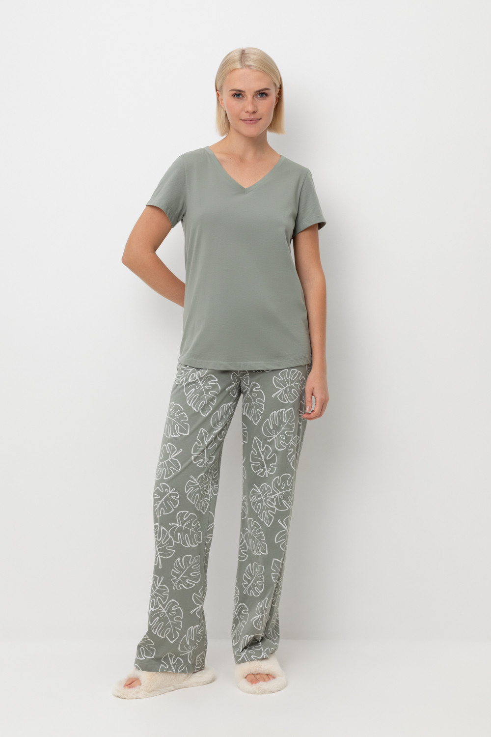 Легкий комплект для комфортного сна и отдыха из натурального хлопка. Футболка с V-образным вырезом комфортно садится по фигуре.  Брюки с поясом на резинке выполнены из набивного трикотажа. Гладкий материал приятен к телу и позволяет коже дышать.