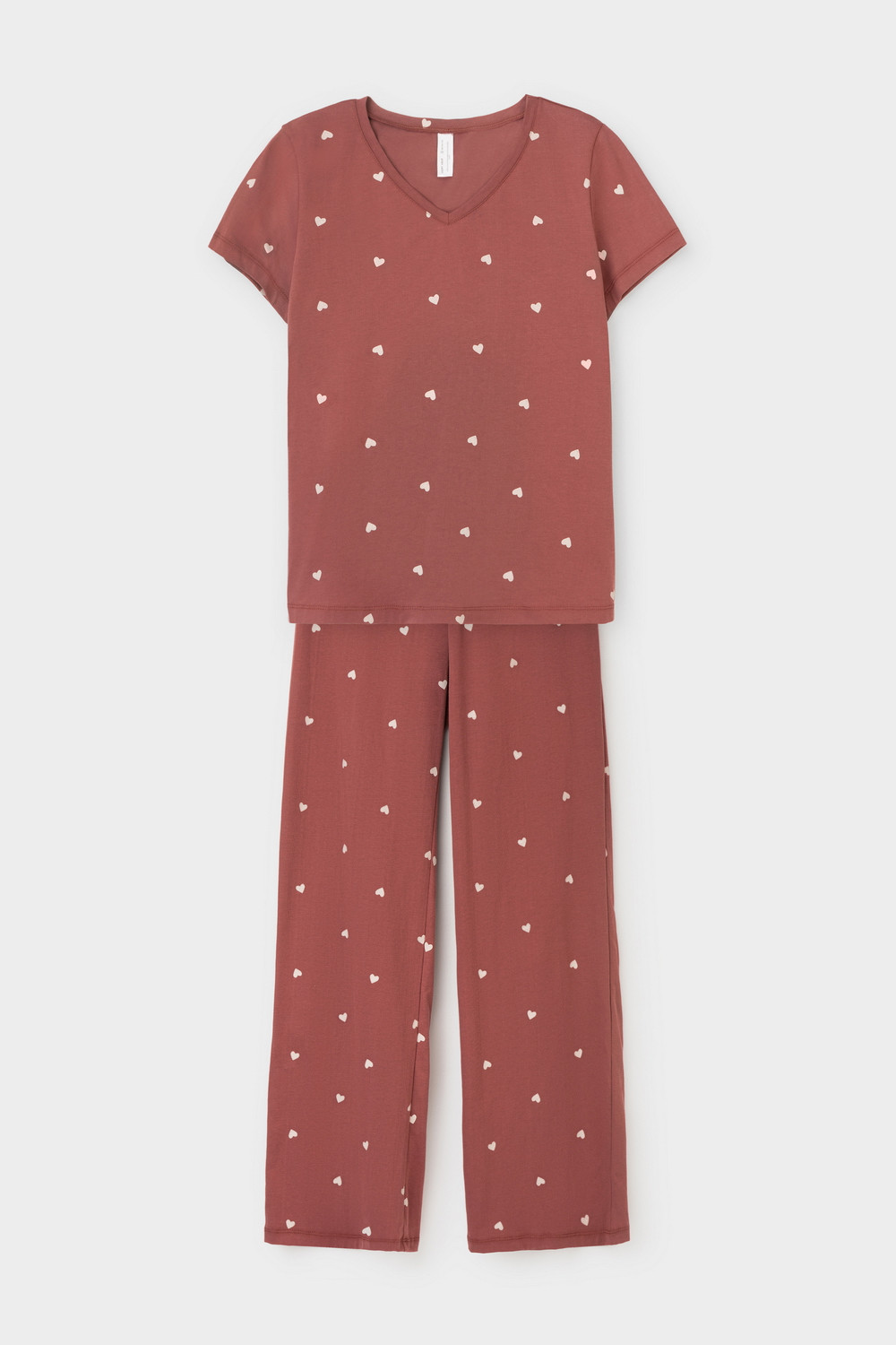 Легкий комплект для комфортного сна и отдыха из натурального хлопка. Футболка с V-образным вырезом комфортно садится по фигуре.  Брюки с поясом на резинке выполнены из набивного трикотажа. Гладкий материал приятен к телу и позволяет коже дышать.