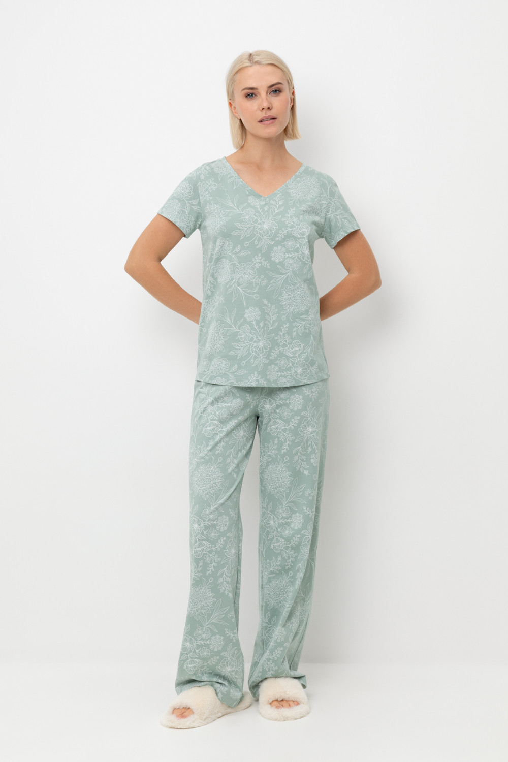 Легкий комплект для комфортного сна и отдыха из натурального хлопка. Футболка с V-образным вырезом комфортно садится по фигуре.  Брюки с поясом на резинке выполнены из набивного трикотажа. Гладкий материал приятен к телу и позволяет коже дышать.