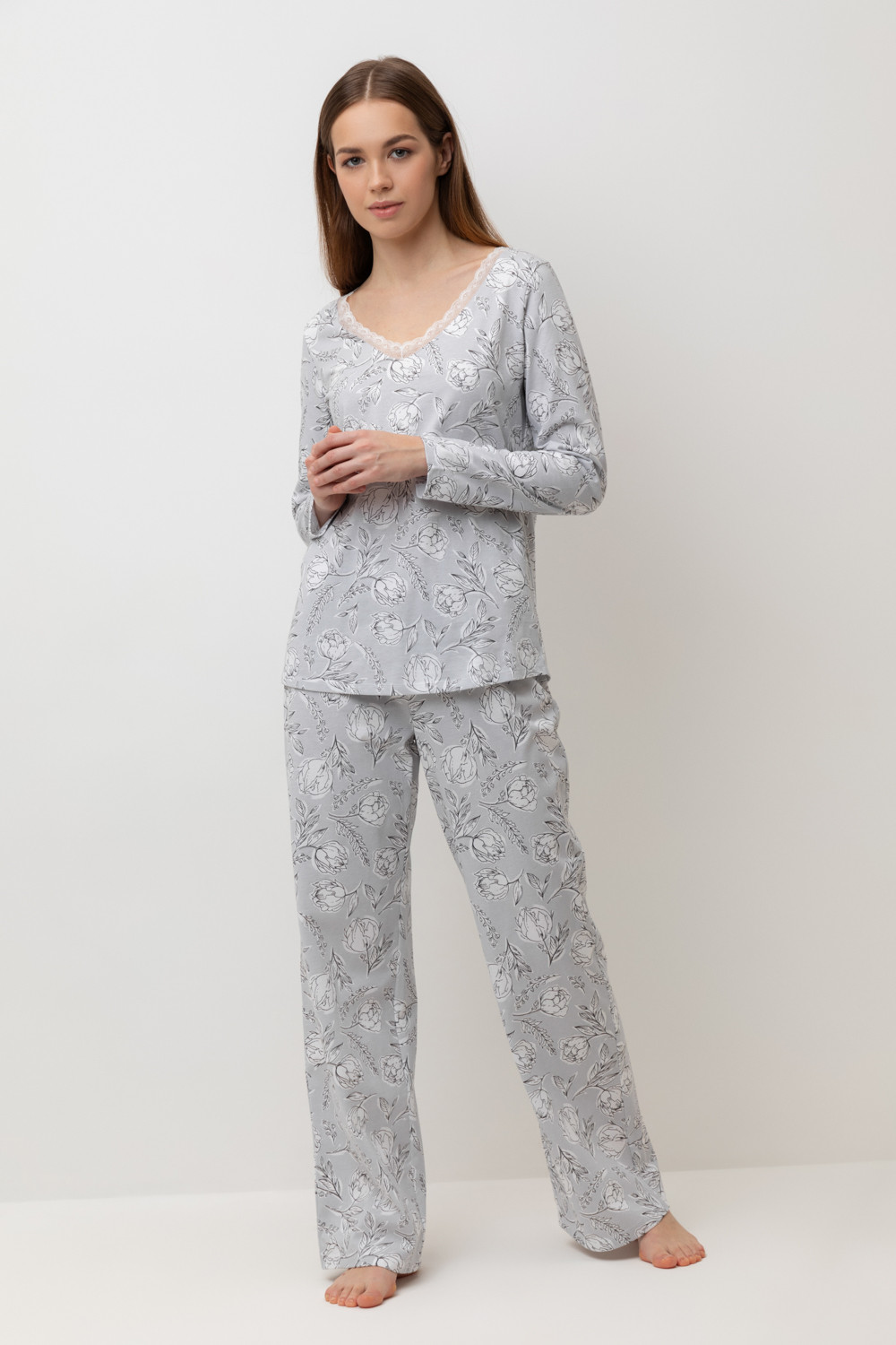 Легкий комплект для комфортного сна и отдыха набивного трикотажа с нежным рисунком из 100% натурального хлопка. Джемпер с V-образным вырезом, украшенный эластичным кружевом комфортно садится по фигуре.  Брюки с поясом на резинке и атласной лентой. Гладкий материал приятен к телу и позволяет коже дышать.