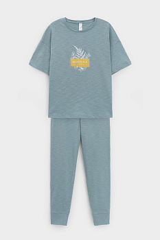 Легкий комплект для комфортного сна и отдыха.  Футболка с принтом и спущенной линией плеча комфортно садится по фигуре.  Брюки с эластичными манжетами с боковыми карманами. Круглый шнур позволяет регулировать посадку. Гладкий материал приятен к телу и позволяет коже дышать.