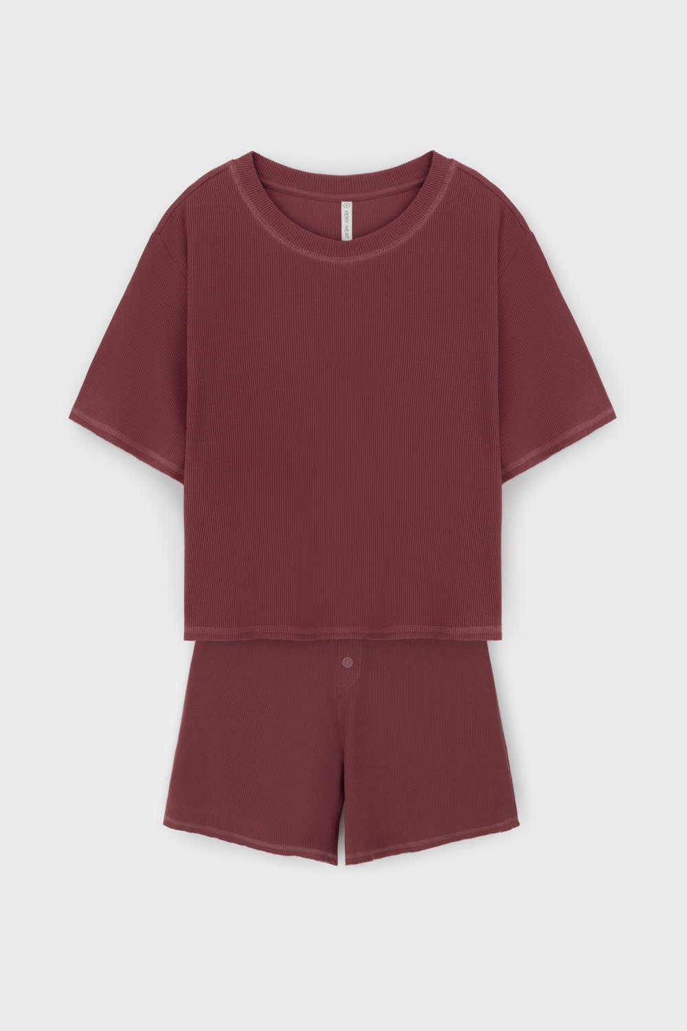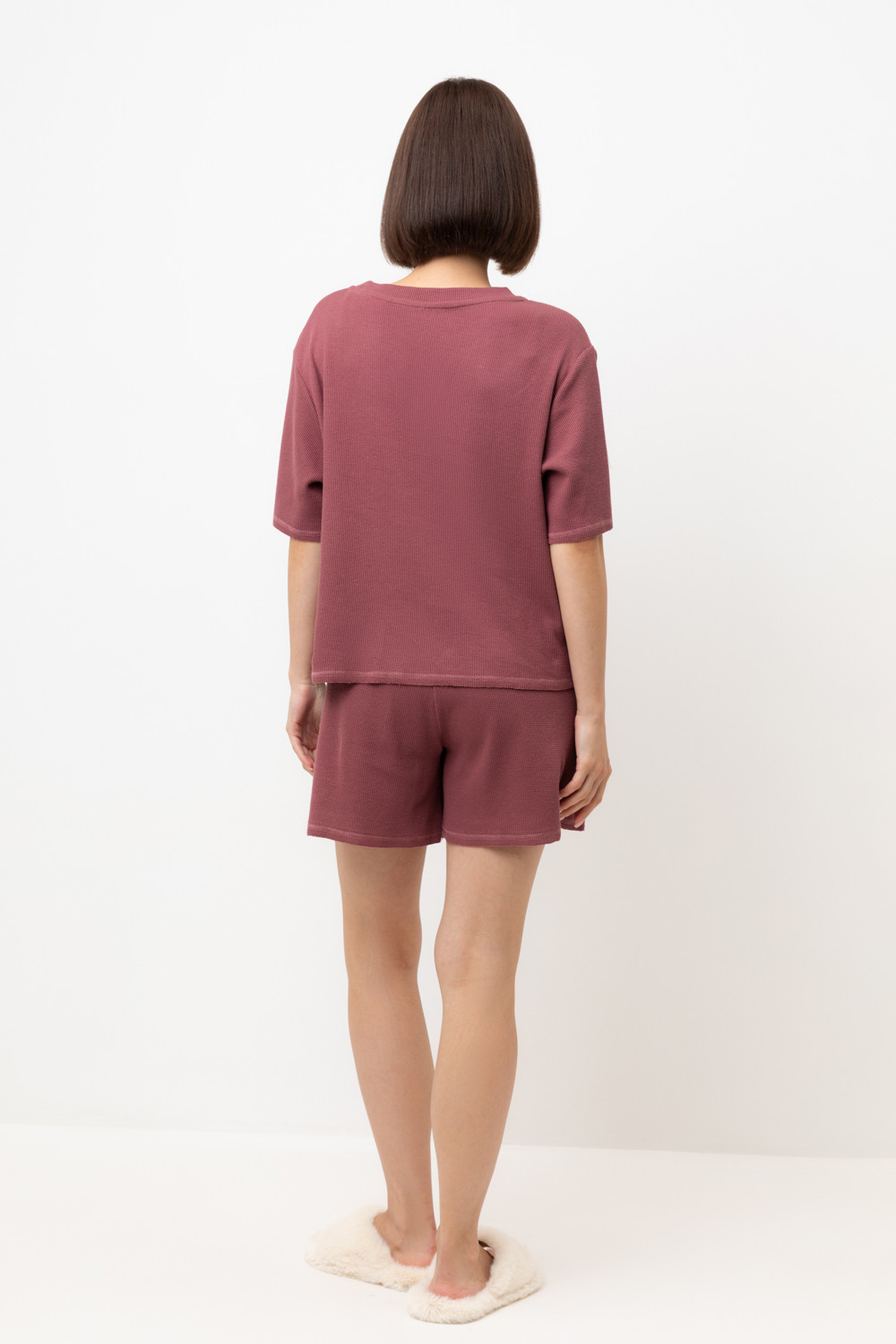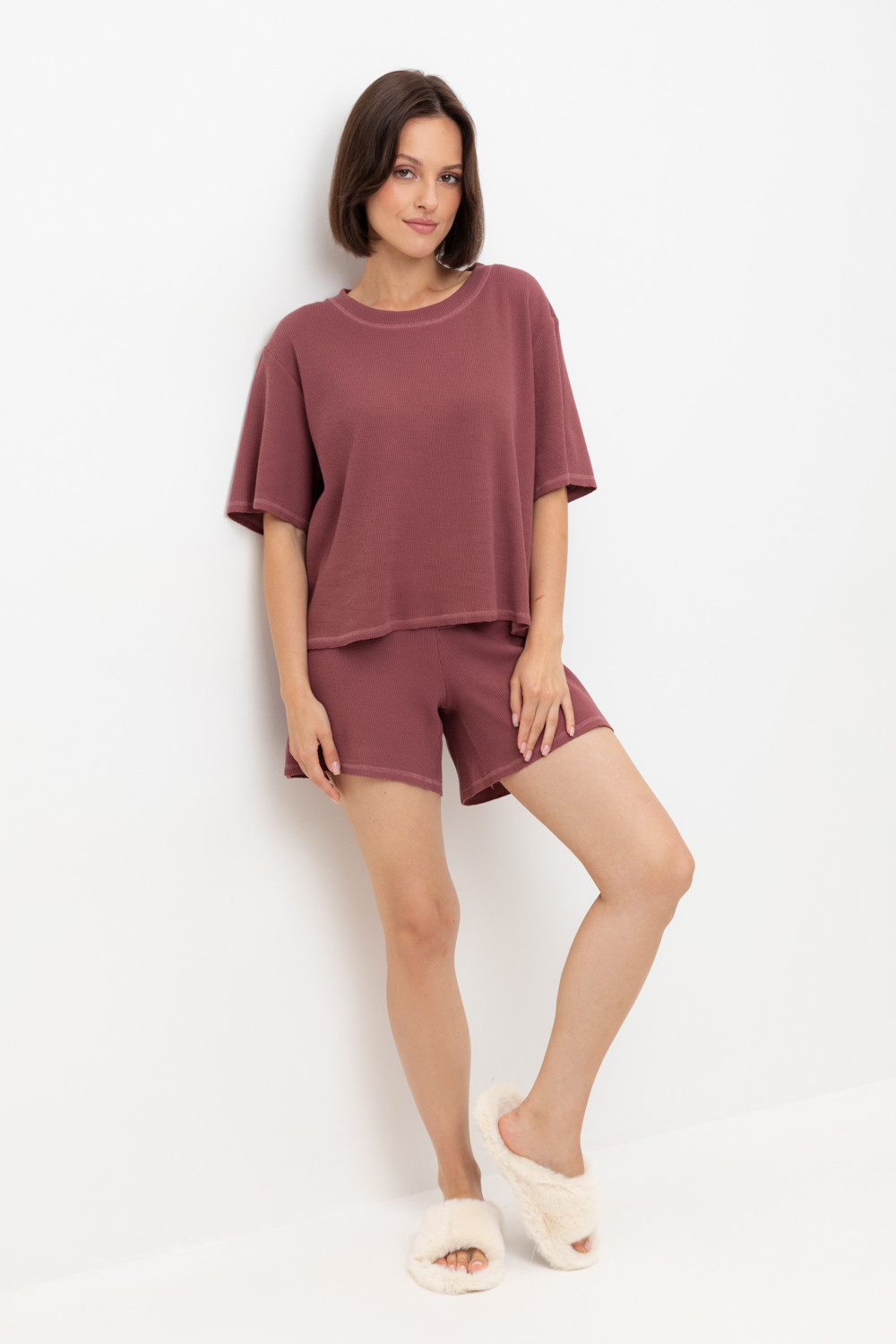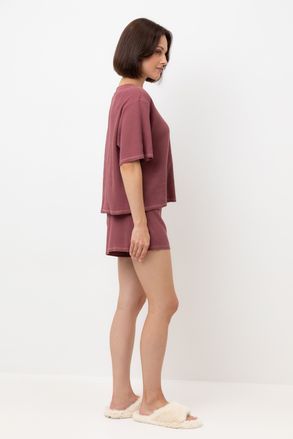 Комплект из объемного трикотажа с добавлением эластичных волокон. Свободный силуэт и мягкий пояс  обеспечат комфорт во время сна и отдыха.