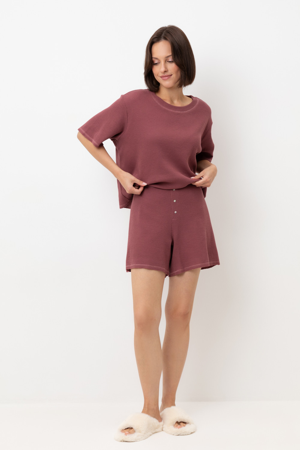 Комплект из объемного трикотажа с добавлением эластичных волокон. Свободный силуэт и мягкий пояс  обеспечат комфорт во время сна и отдыха.