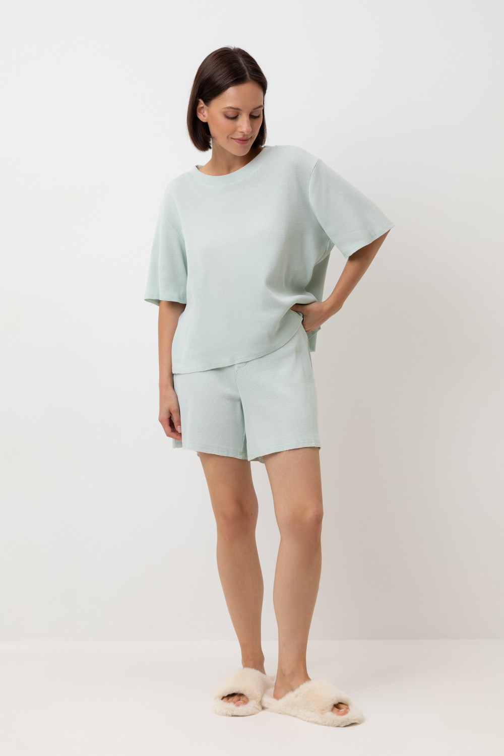 Комплект из объемного трикотажа с добавлением эластичных волокон. Свободный силуэт и мягкий пояс  обеспечат комфорт во время сна и отдыха.