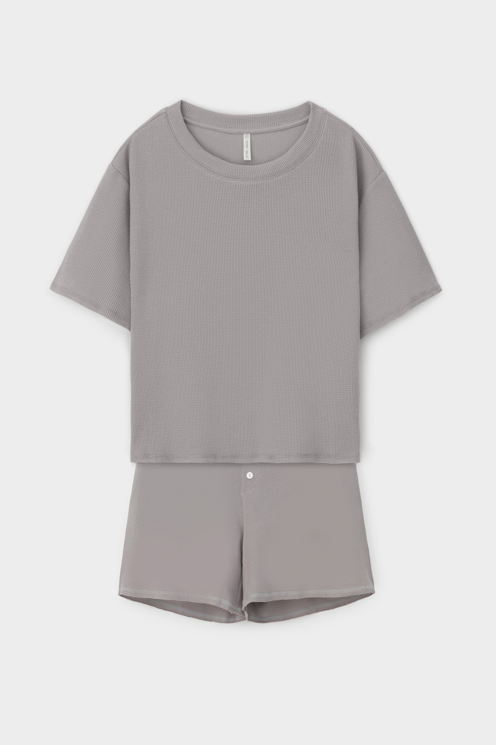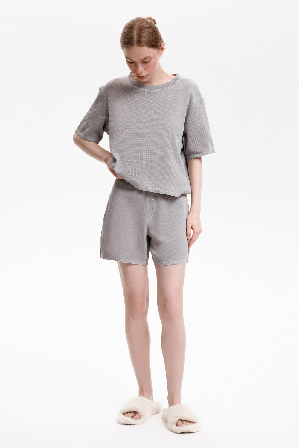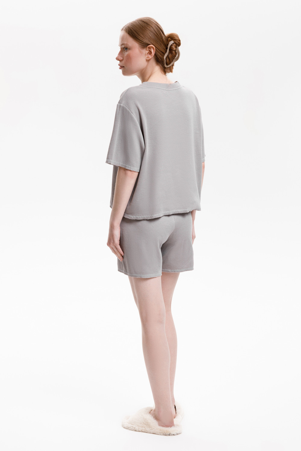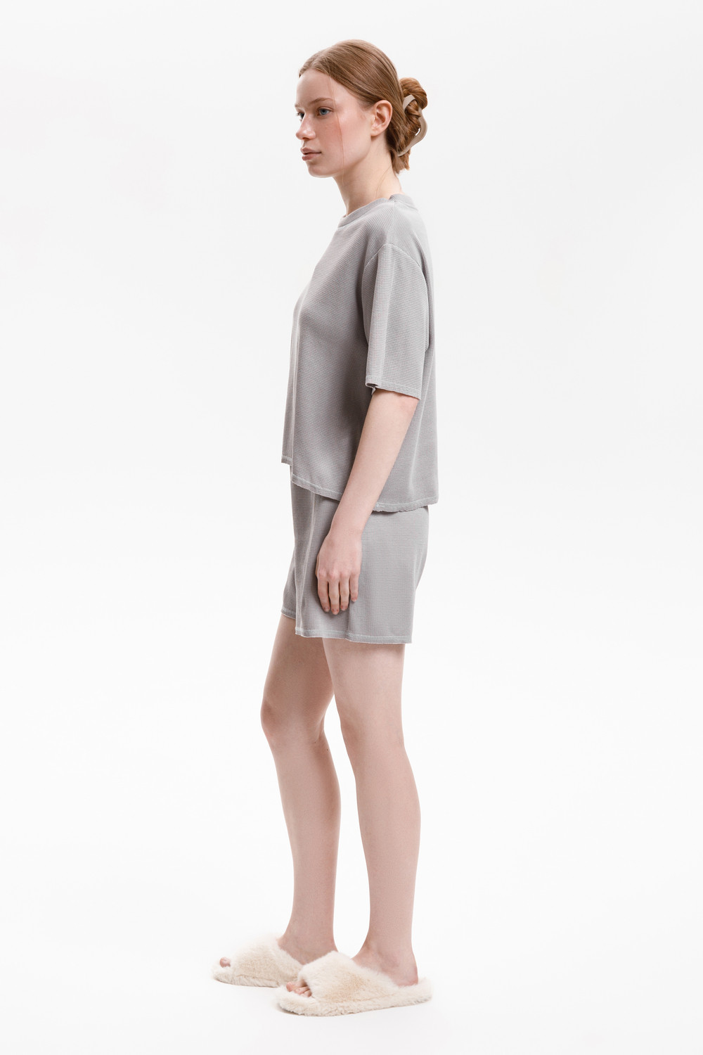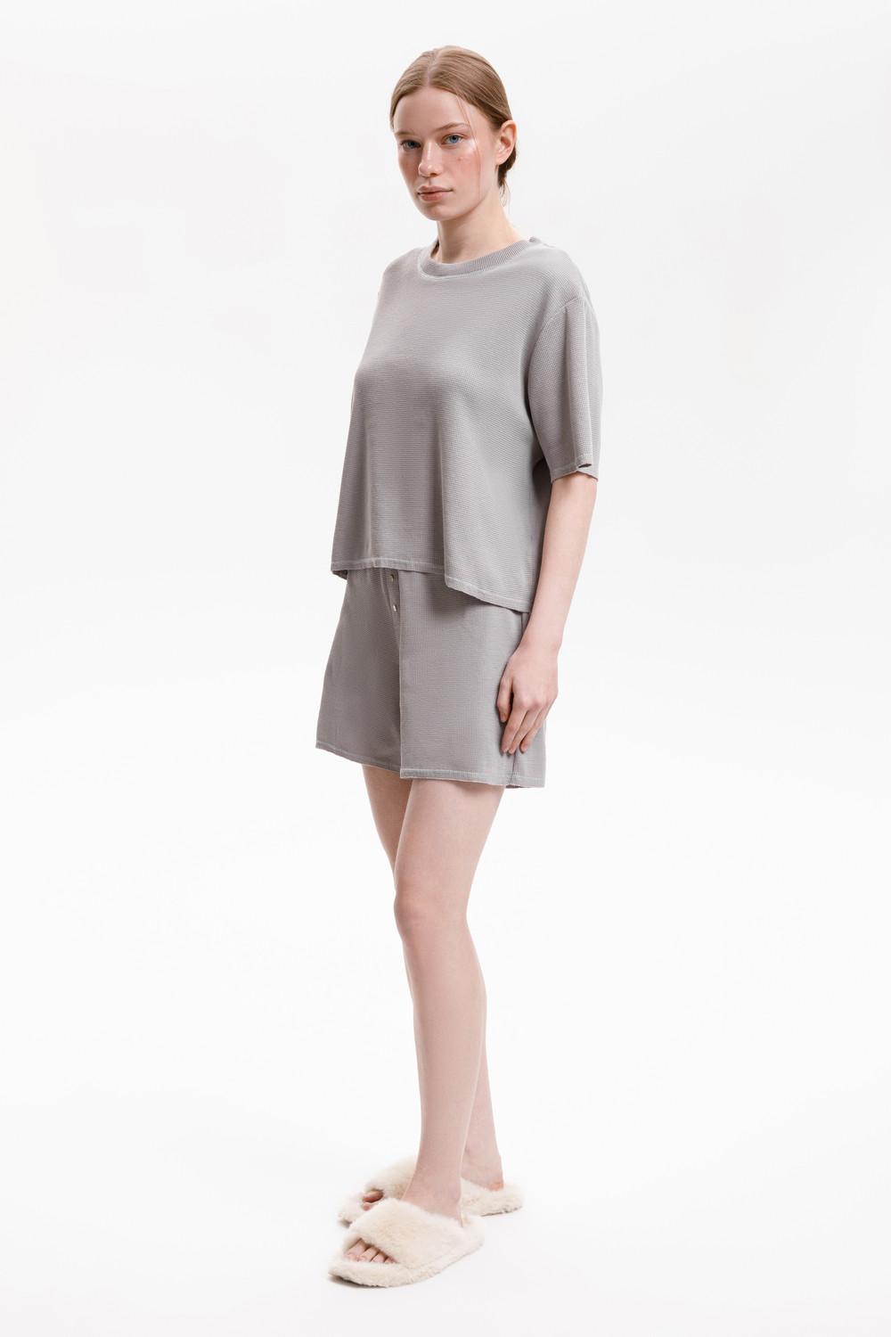 Комплект из объемного трикотажа с добавлением эластичных волокон. Свободный силуэт и мягкий пояс  обеспечат комфорт во время сна и отдыха.