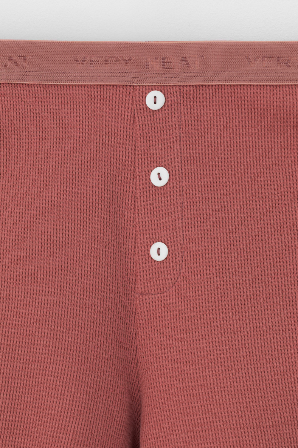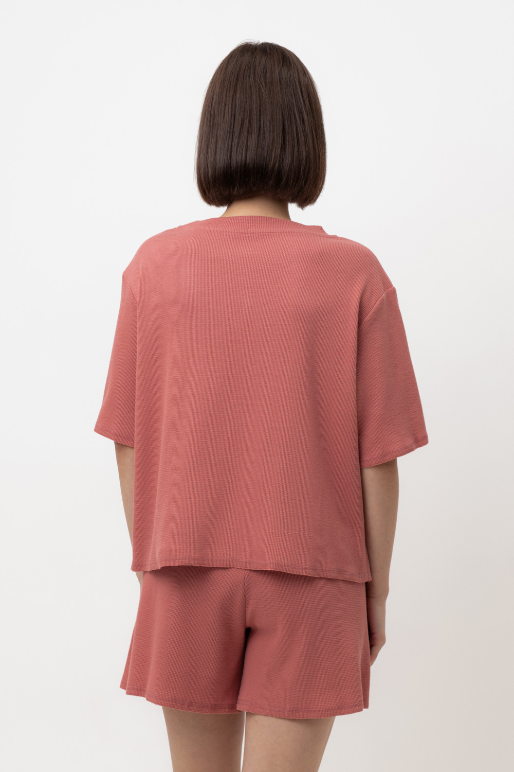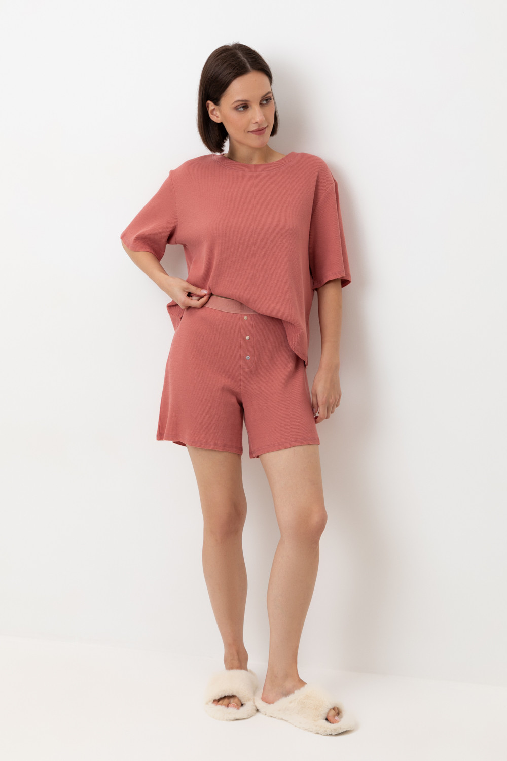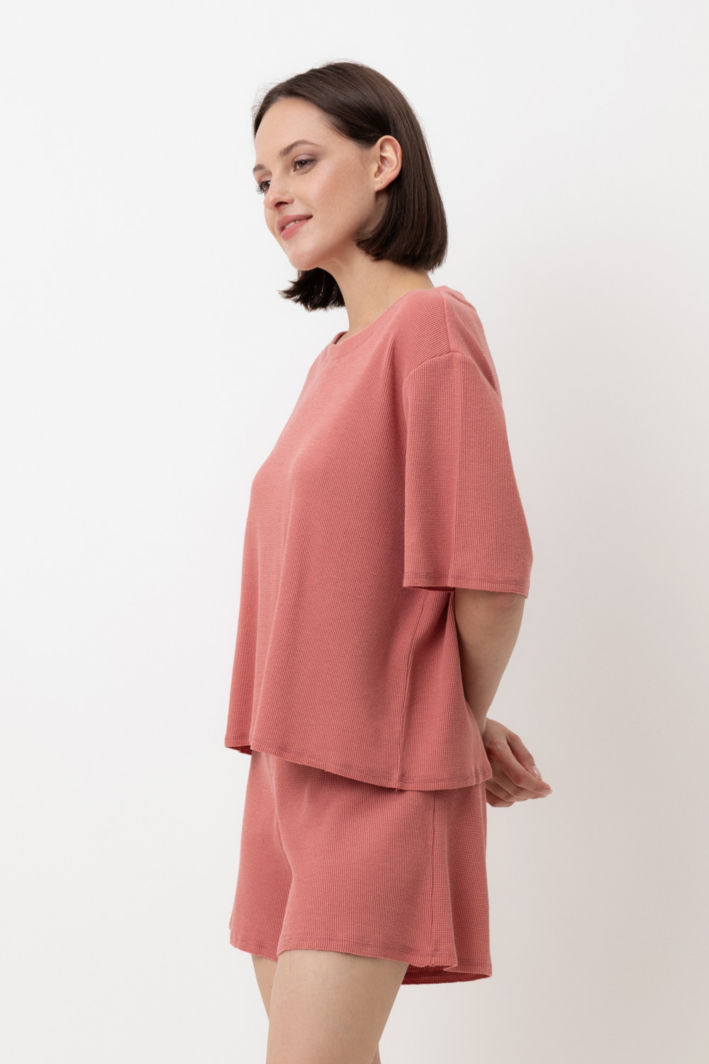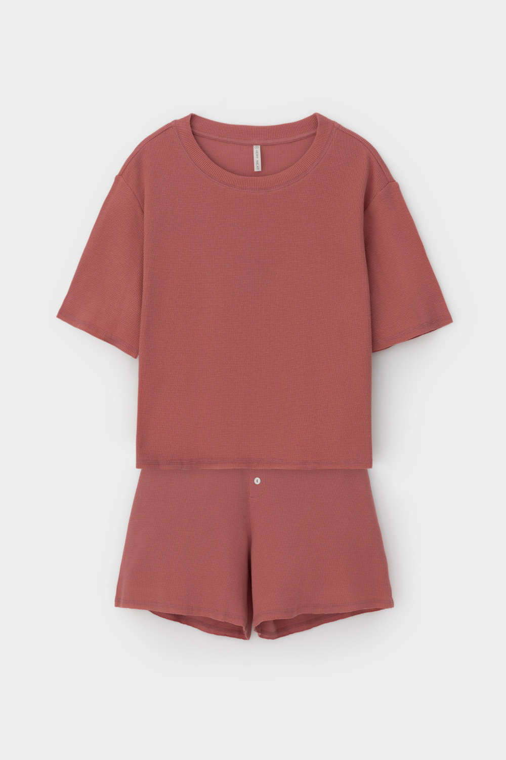 Комплект из объемного трикотажа с добавлением эластичных волокон. Свободный силуэт и мягкий пояс  обеспечат комфорт во время сна и отдыха.