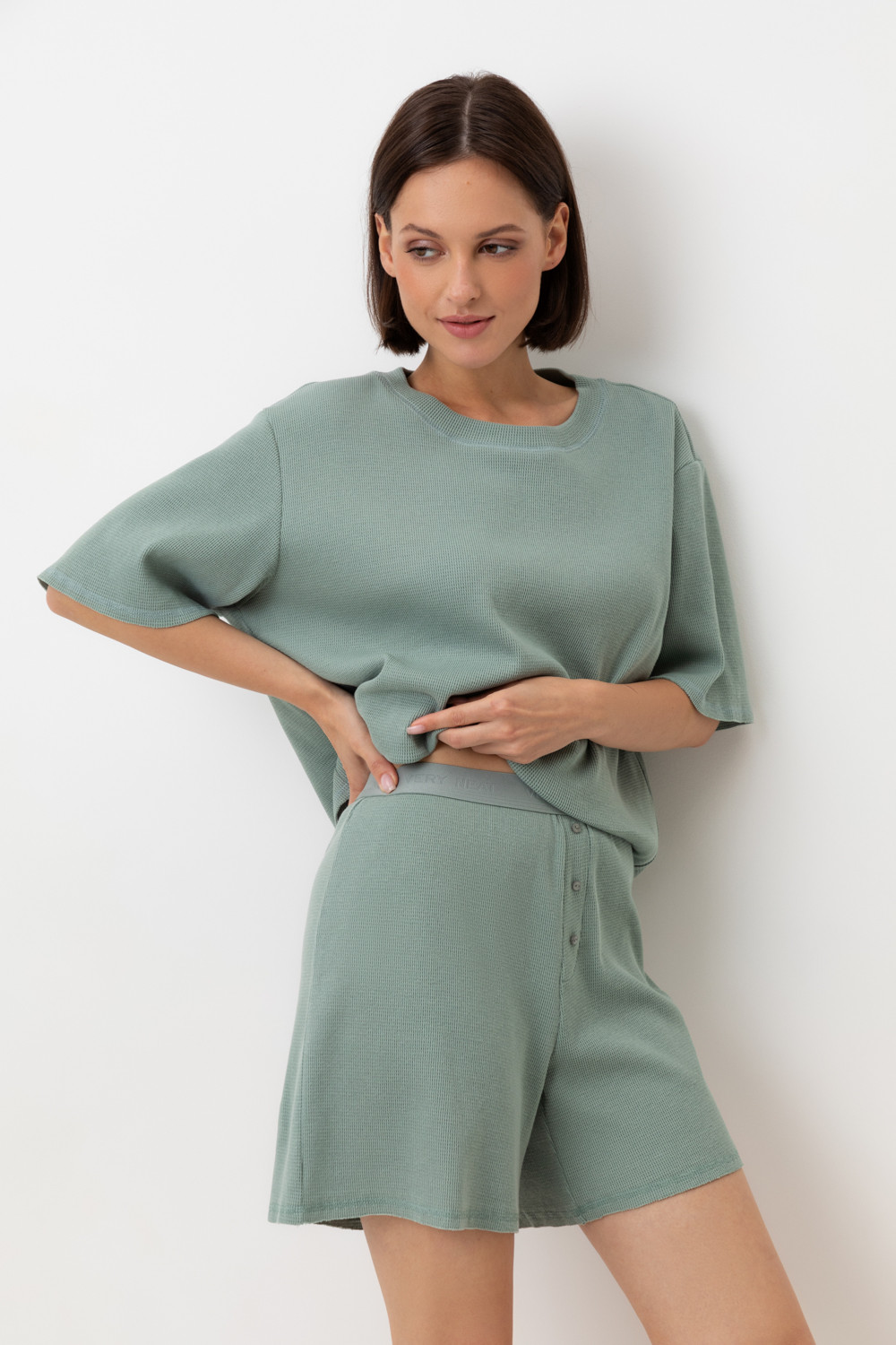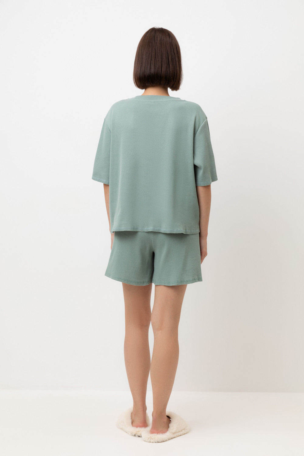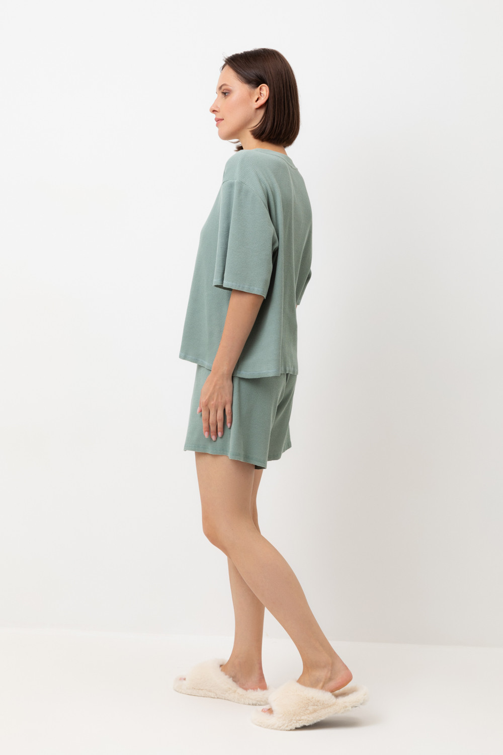 Комплект из объемного трикотажа с добавлением эластичных волокон. Свободный силуэт и мягкий пояс  обеспечат комфорт во время сна и отдыха.