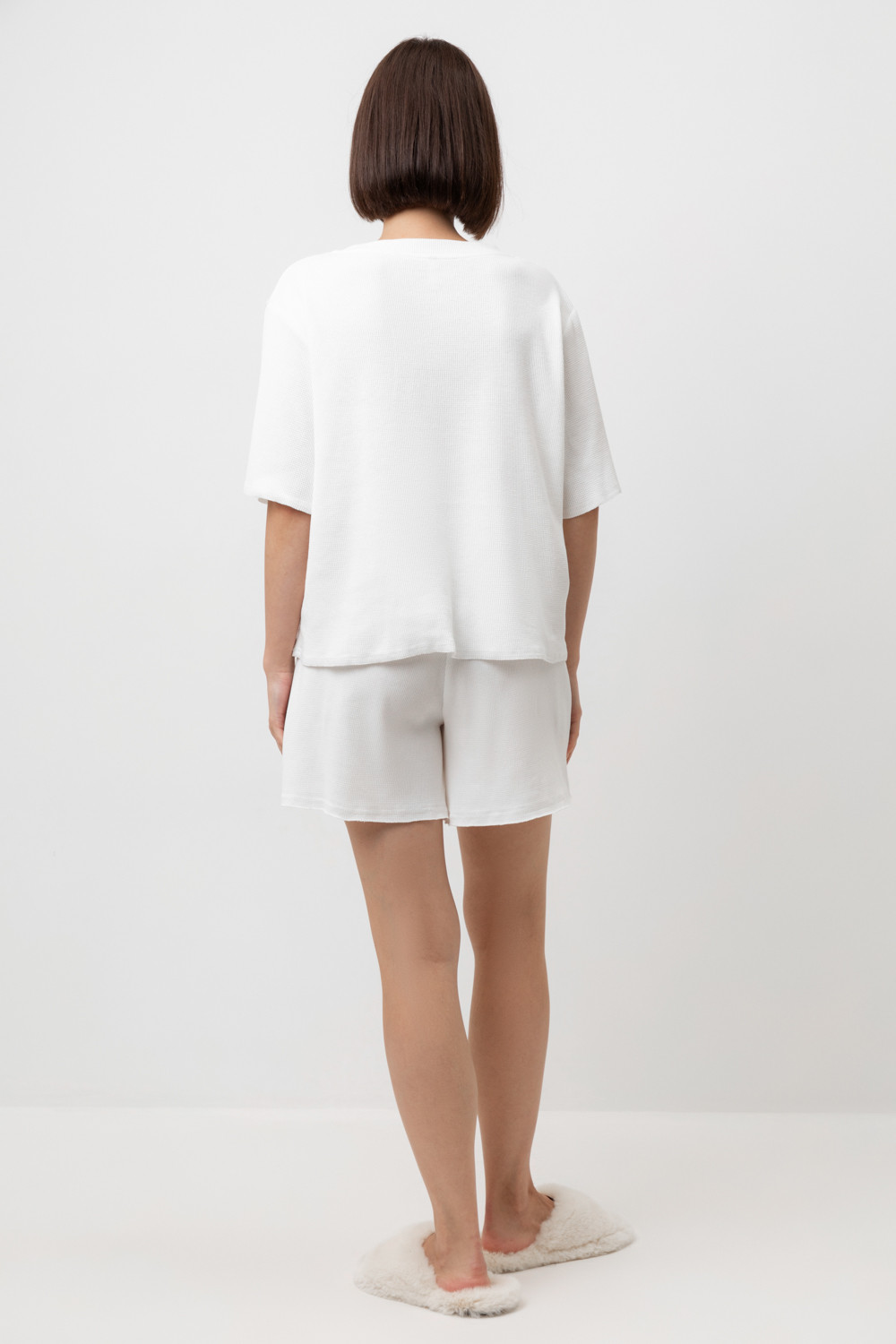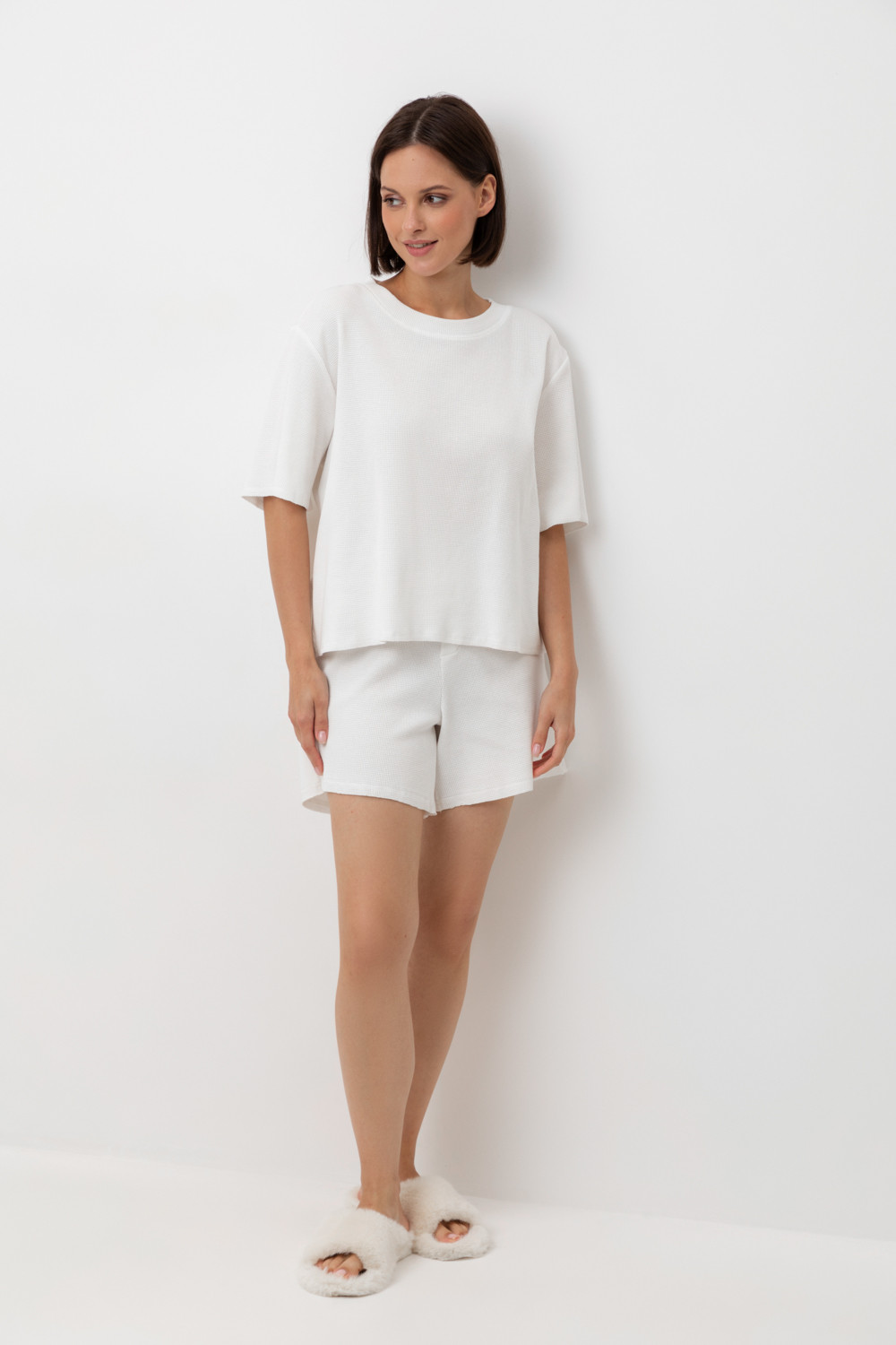 Комплект из объемного трикотажа с добавлением эластичных волокон. Свободный силуэт и мягкий пояс  обеспечат комфорт во время сна и отдыха.