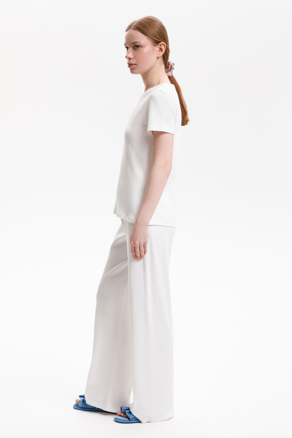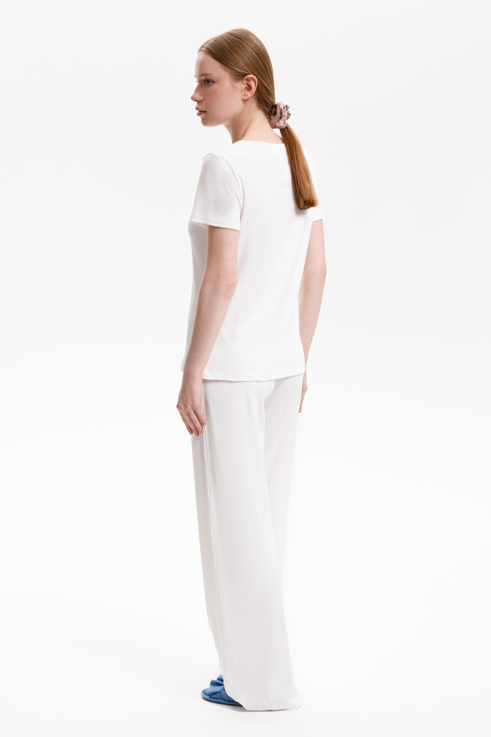 Комплект из нежнейшего высококачественного трикотажного полотна с добавлением спандекса. За счет фактуры переплетения и специальных обработок сохраняет силуэт и форму. Свободный крой футболки и мягкий пояс на брюках обеспечивают легкость и свободу движений.
