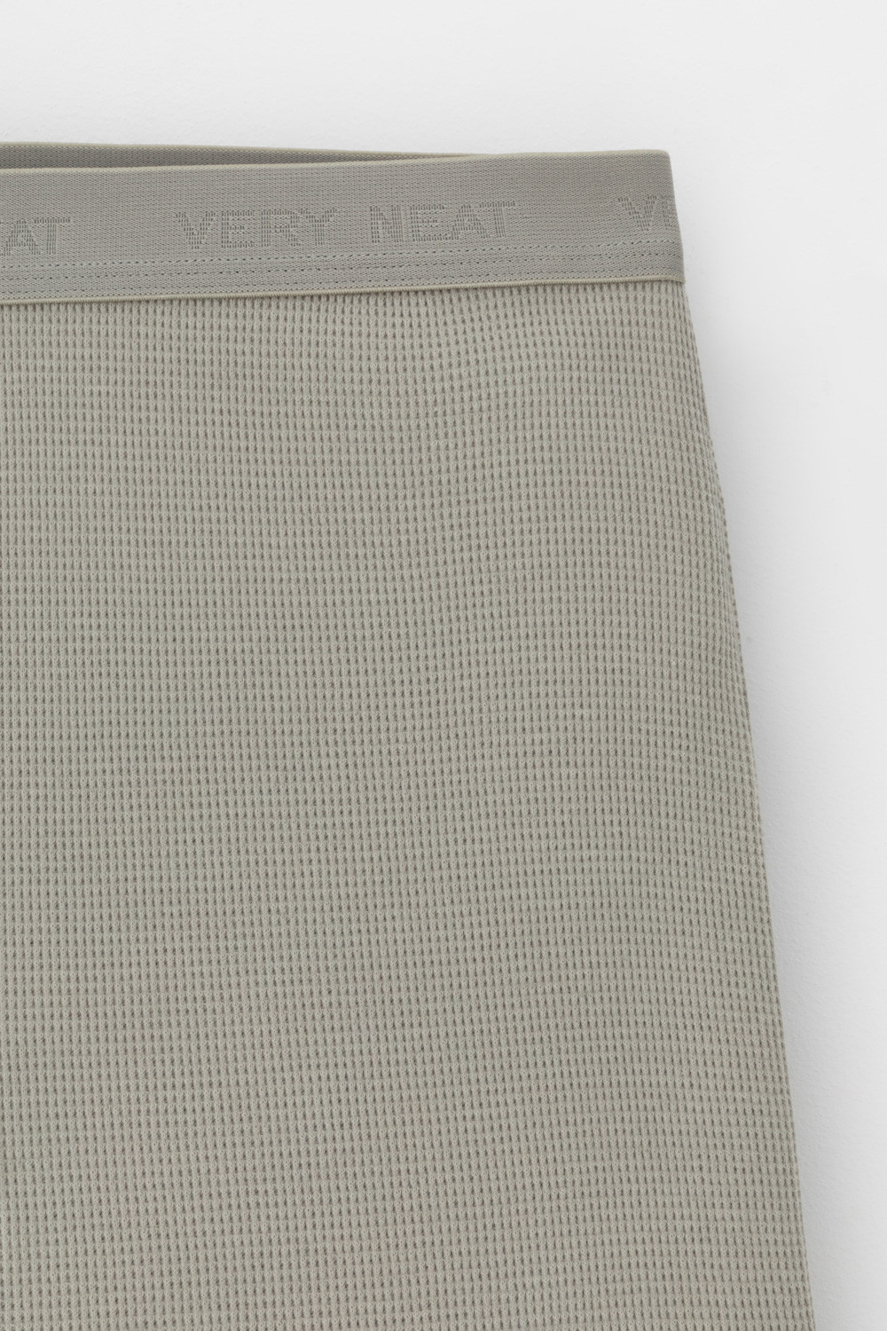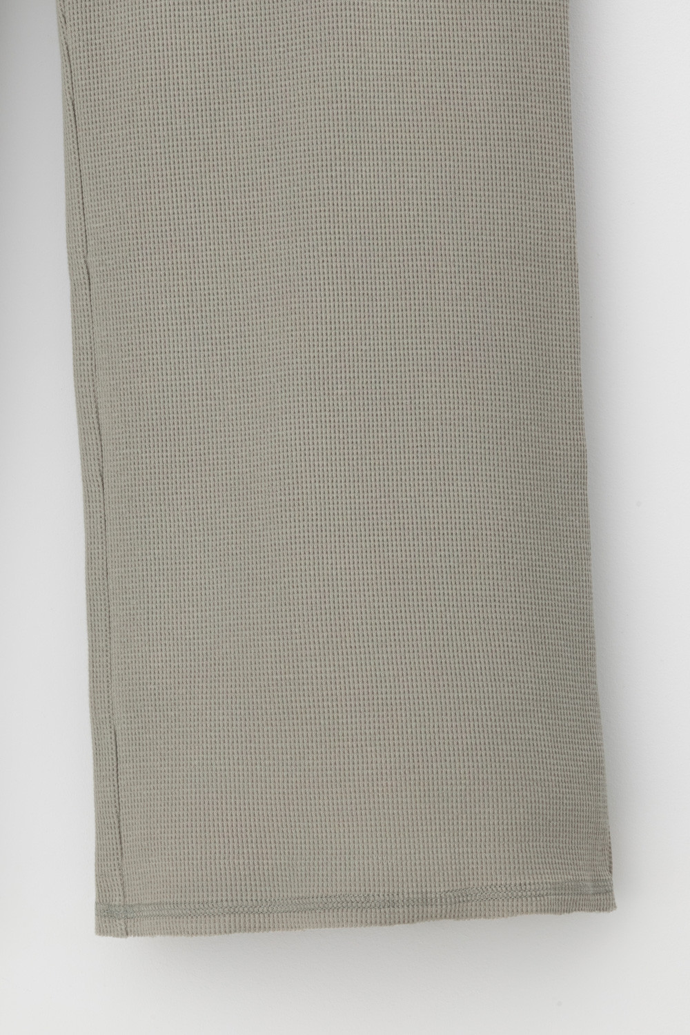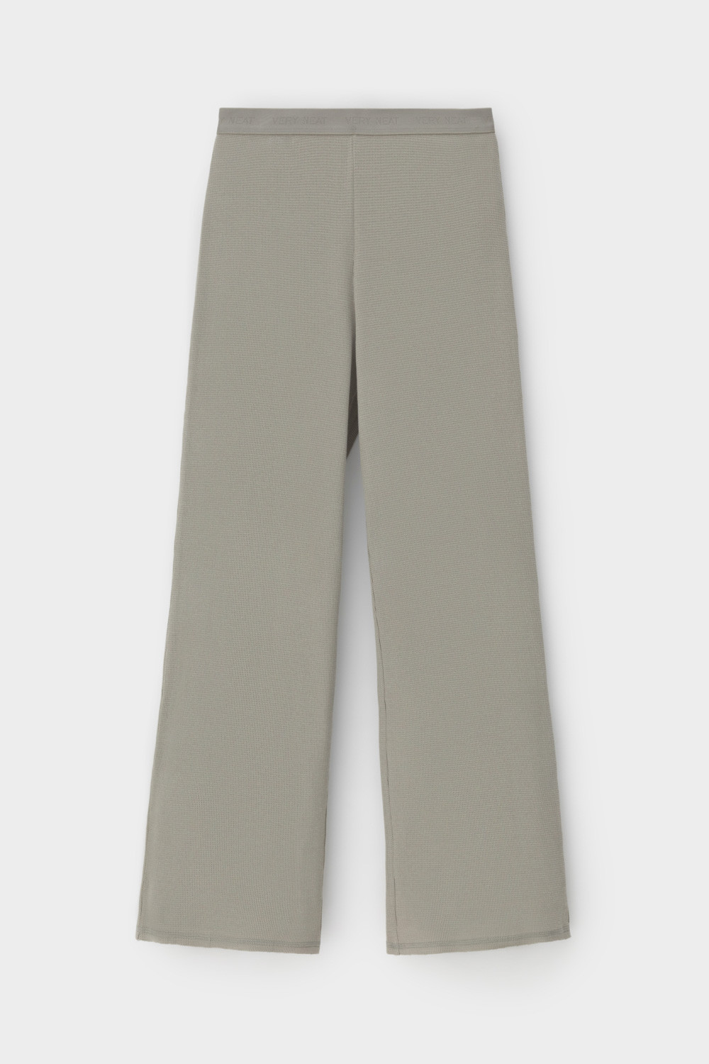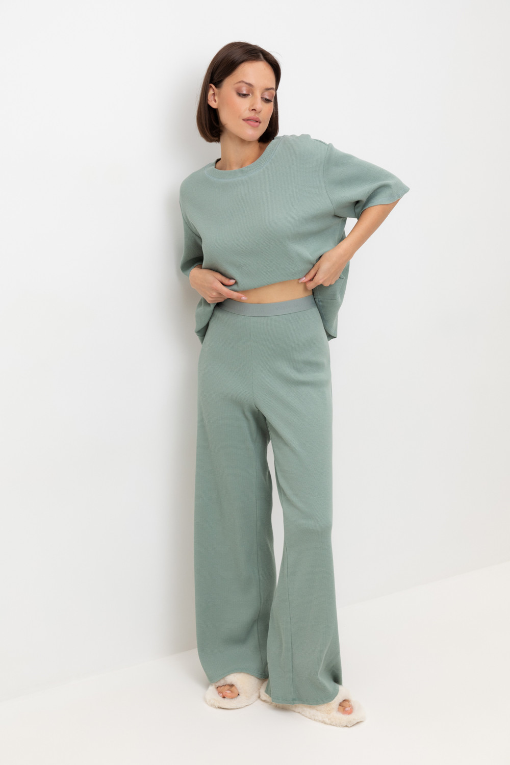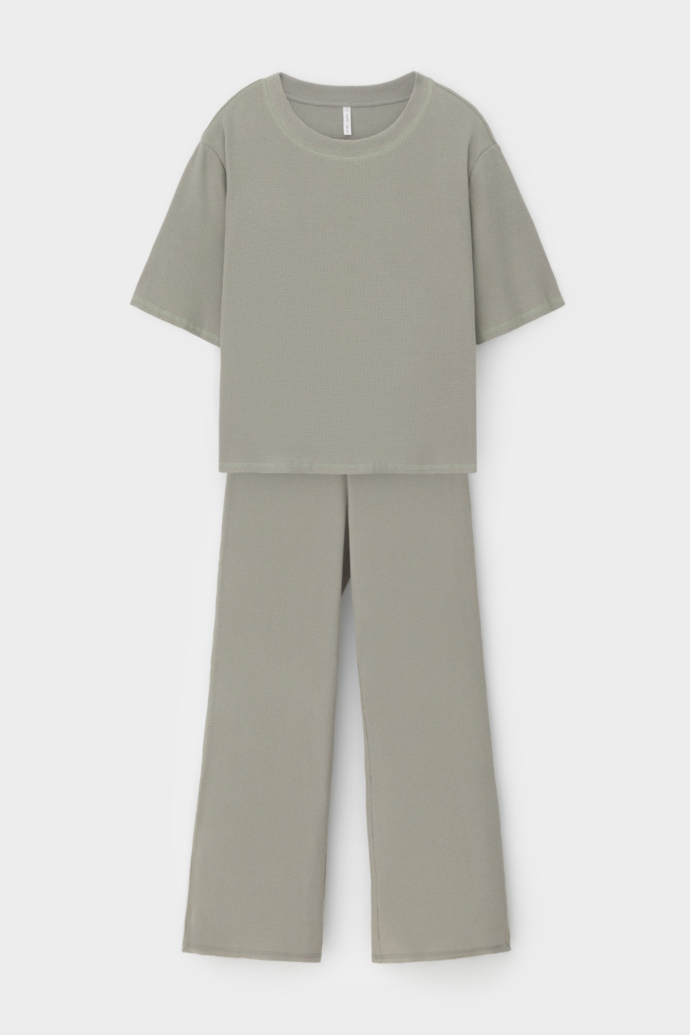 Комплект из объемного трикотажа с добавлением эластичных волокон. Свободный силуэт, мягкий пояс и отсутствие боковых швов на брюках обеспечат комфорт во время сна и отдыха.