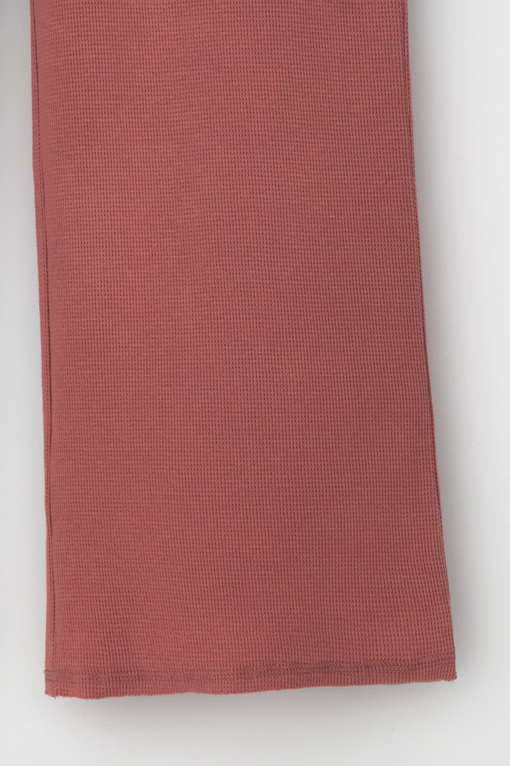 Комплект из объемного трикотажа с добавлением эластичных волокон. Свободный силуэт, мягкий пояс и отсутствие боковых швов на брюках обеспечат комфорт во время сна и отдыха.