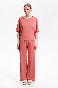 Комплект из объемного трикотажа с добавлением эластичных волокон. Свободный силуэт, мягкий пояс и отсутствие боковых швов на брюках обеспечат комфорт во время сна и отдыха.