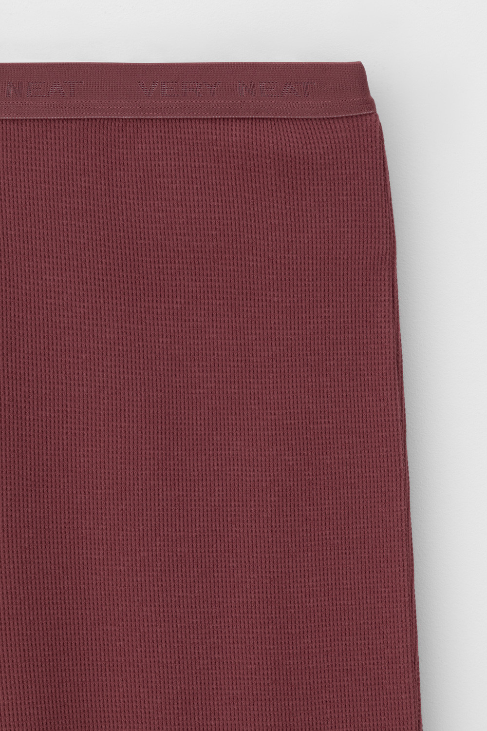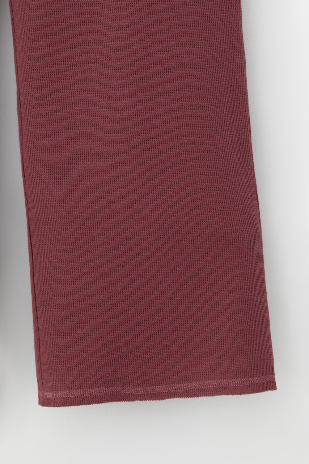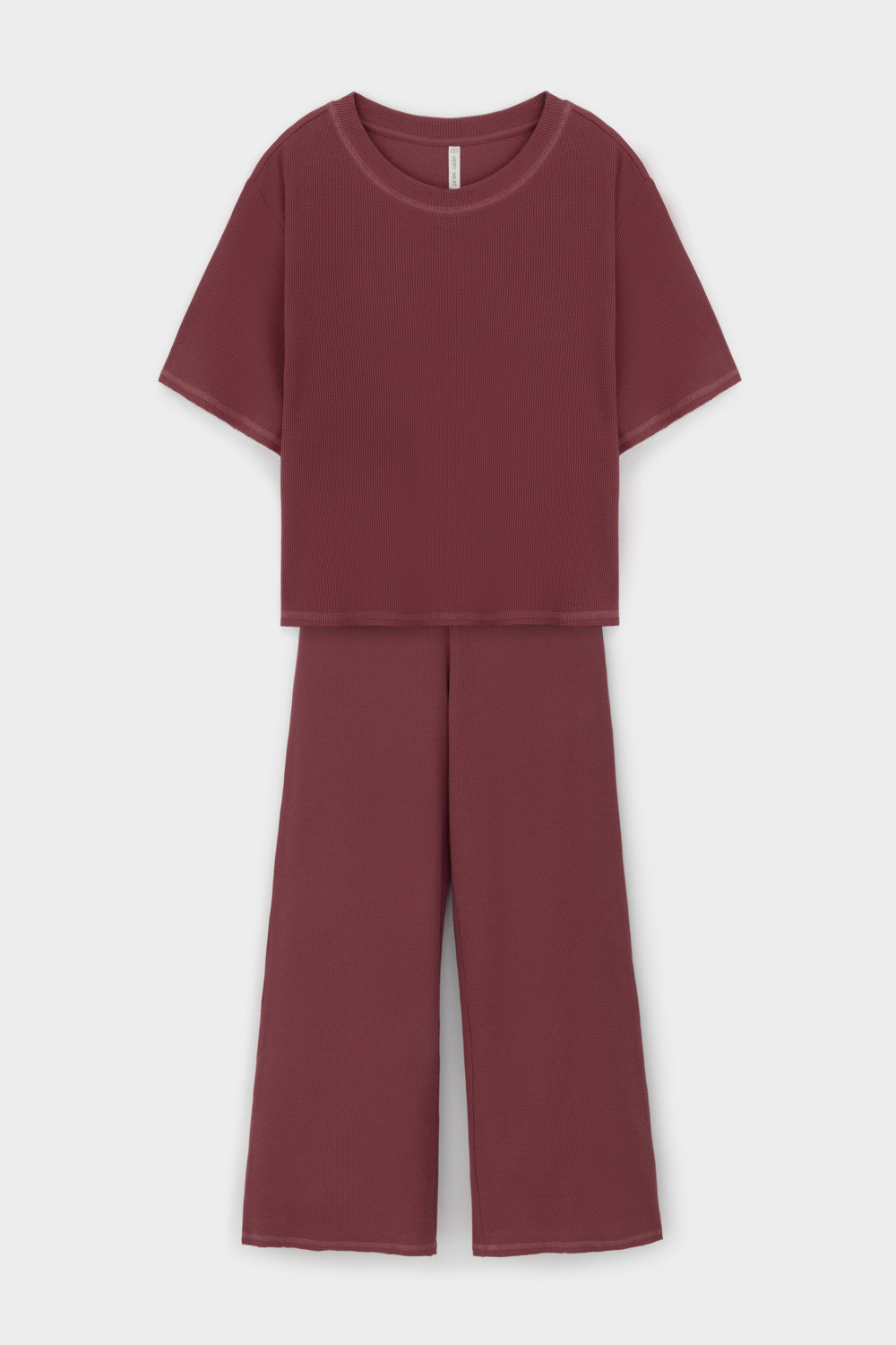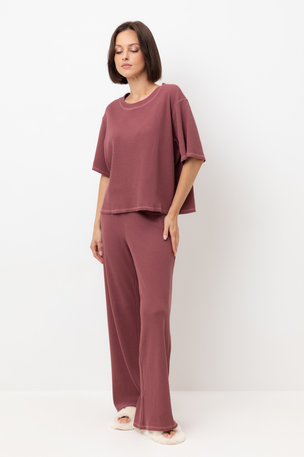 Комплект из объемного трикотажа с добавлением эластичных волокон. Свободный силуэт, мягкий пояс и отсутствие боковых швов на брюках обеспечат комфорт во время сна и отдыха.