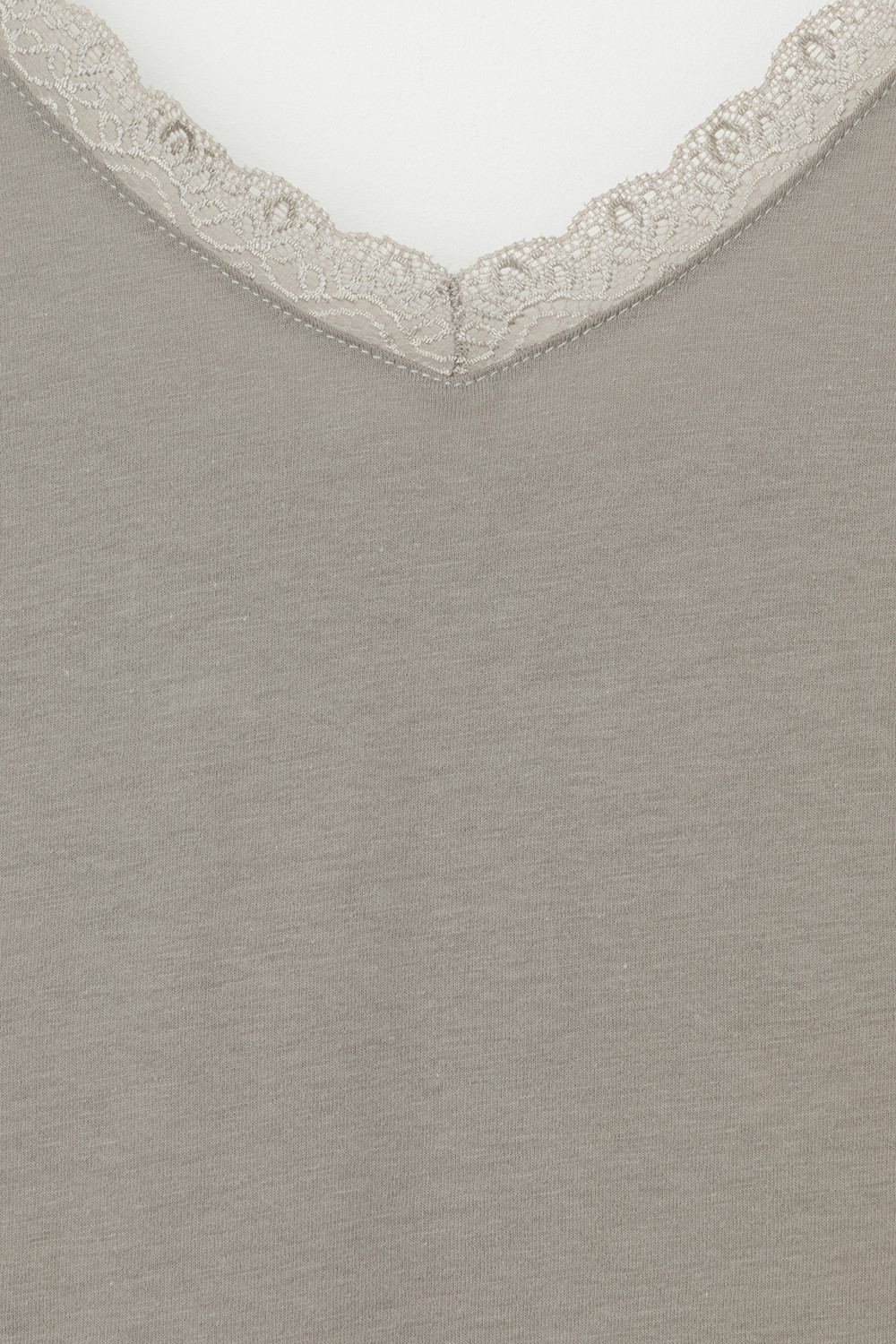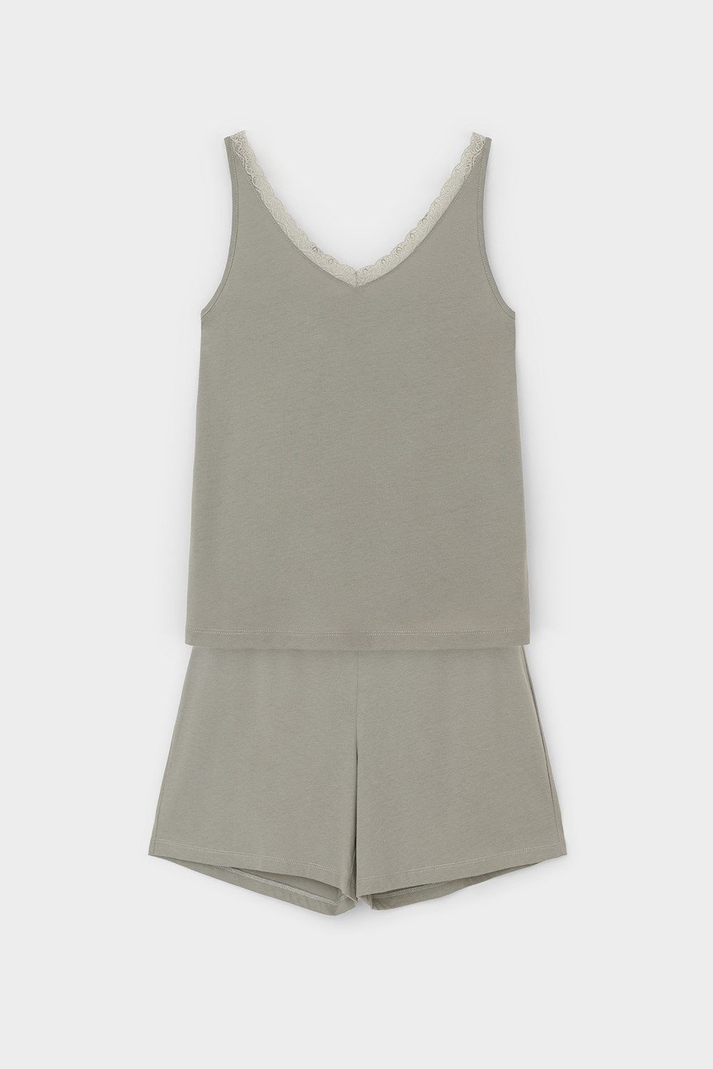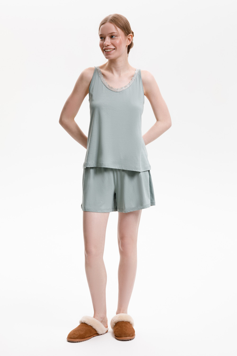 Легкий комплект приглушенного зеленого оттенка выполнен из хлопка с нежнейшим модалом. Свободный крой топа декорированный эластичным кружевом и мягкий пояс шорт обеспечивают легкость и свободу движений.