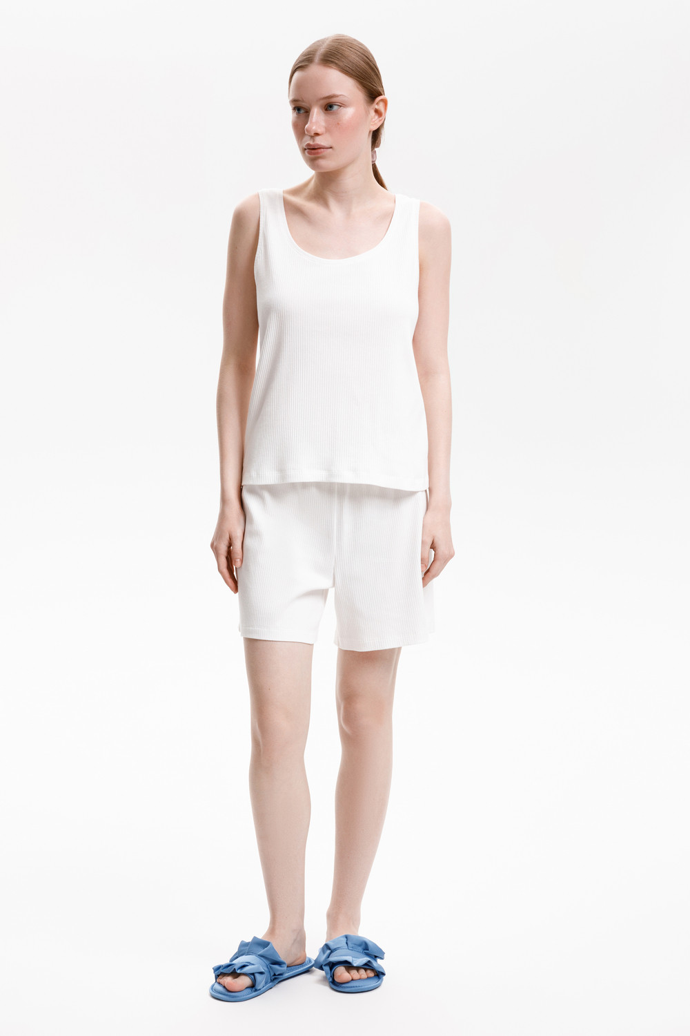 Комплект из нежнейшего высококачественного трикотажного полотна с добавлением спандекса. За счет фактуры переплетения и специальных обработок сохраняет силуэт и форму. Свободный крой топа и мягкий пояс шорт обеспечивают легкость и свободу движений.