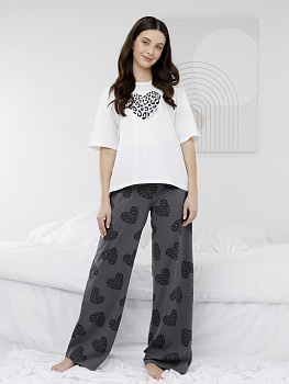 Трикотажная пижама из натурального хлопка для комфортного сна и отдыха. Свободная футболка с короткими рукавами и прямые брюки с мягкой эластичной резинкой в поясе. Гладкий материал приятен к телу, не теряет форму и позволяет коже дышать. Оригинальный принт и набивка выполнены из стойких текстильных гипоаллергенных красителей. Все трикотажные полотна производятся в соответствии с нормами швейцарского сертификата ЭкоТекс.