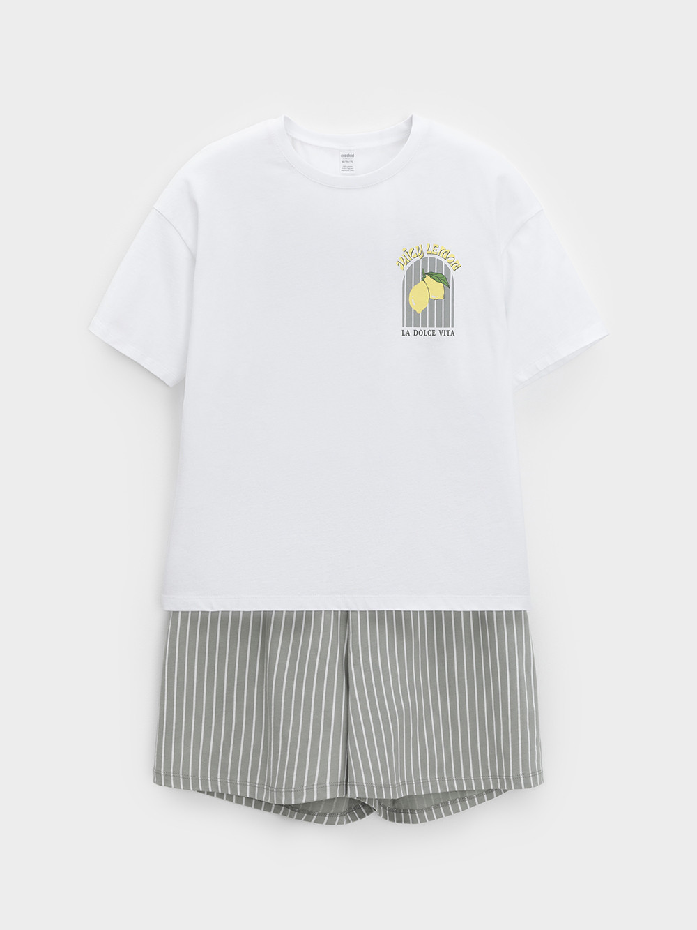 Трикотажная пижама из натурального хлопка для комфортного сна и отдыха. Свободная футболка с короткими спущенными рукавами и шорты с мягкой эластичной резинкой в поясе. Гладкий материал приятен к телу, не теряет форму и позволяет коже дышать. Оригинальный рисунок выполнен из стойких текстильных гипоаллергенных красителей. Все трикотажные полотна производятся в соответствии с нормами швейцарского сертификата ЭкоТекс.