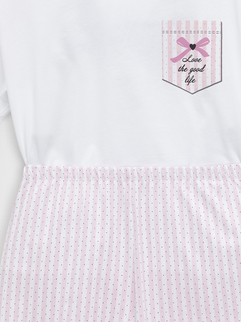 Трикотажная пижама из натурального хлопка для комфортного сна и отдыха. Свободная футболка с короткими спущенными рукавами и шорты с мягкой эластичной резинкой в поясе. Гладкий материал приятен к телу, не теряет форму и позволяет коже дышать. Оригинальный рисунок выполнен из стойких текстильных гипоаллергенных красителей. Все трикотажные полотна производятся в соответствии с нормами швейцарского сертификата ЭкоТекс.