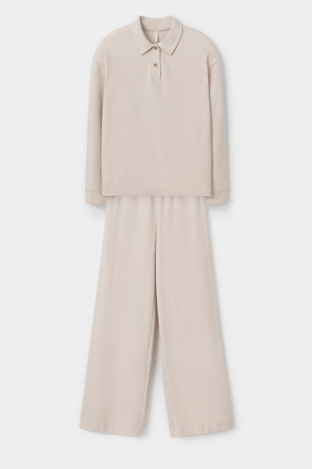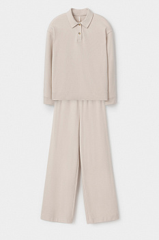 Комплект из 100% хлопка. Специальная обработка полотна пич эффектом придает мягкость, бархатистость и легкий ворс, а брюки без боковых швов и широкие рукава обеспечивают легкость и свободу движений.