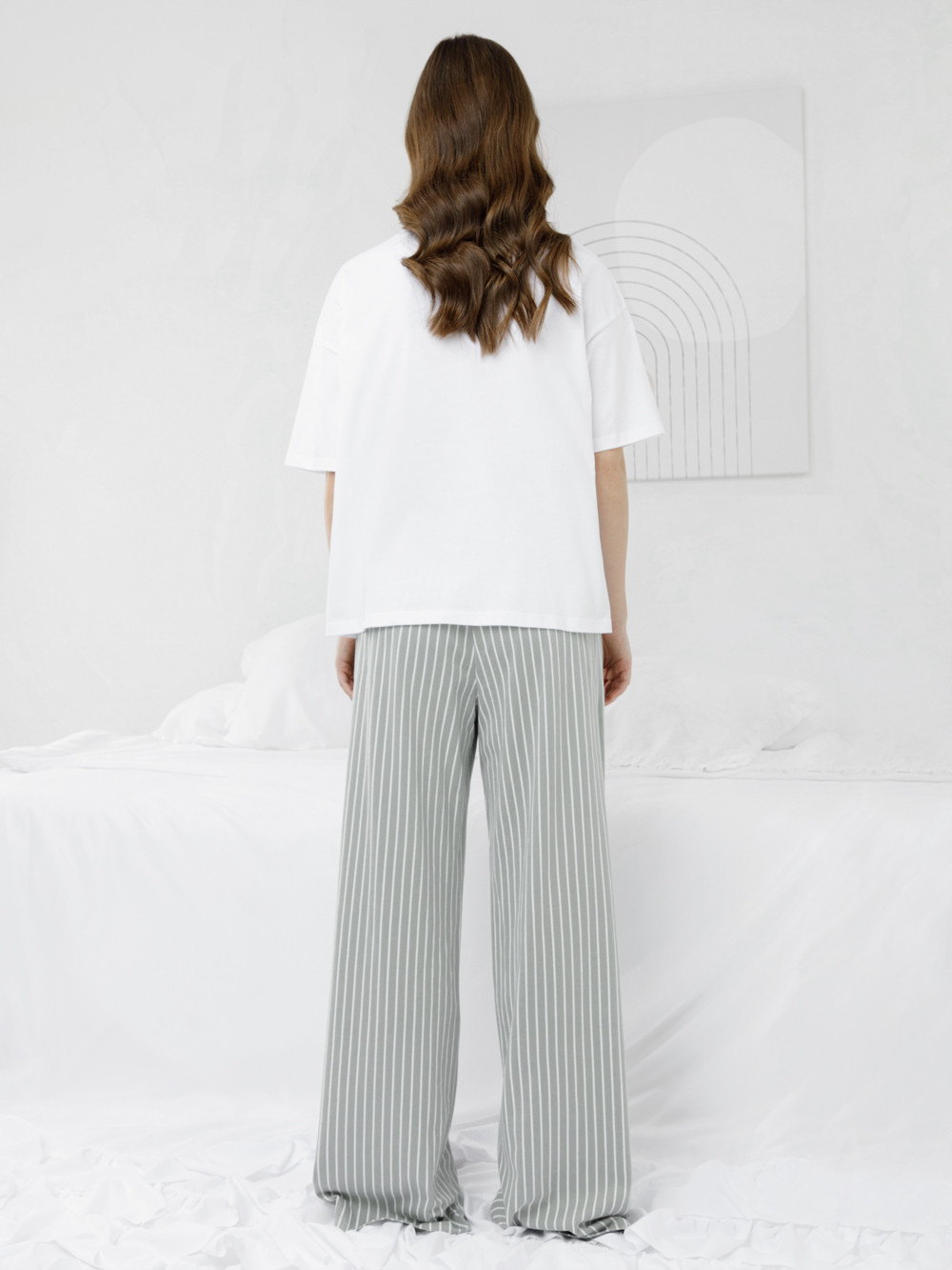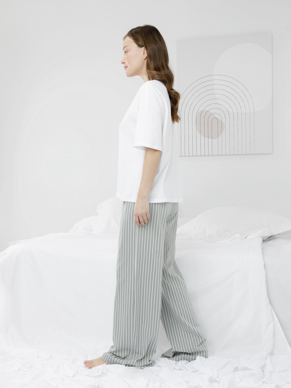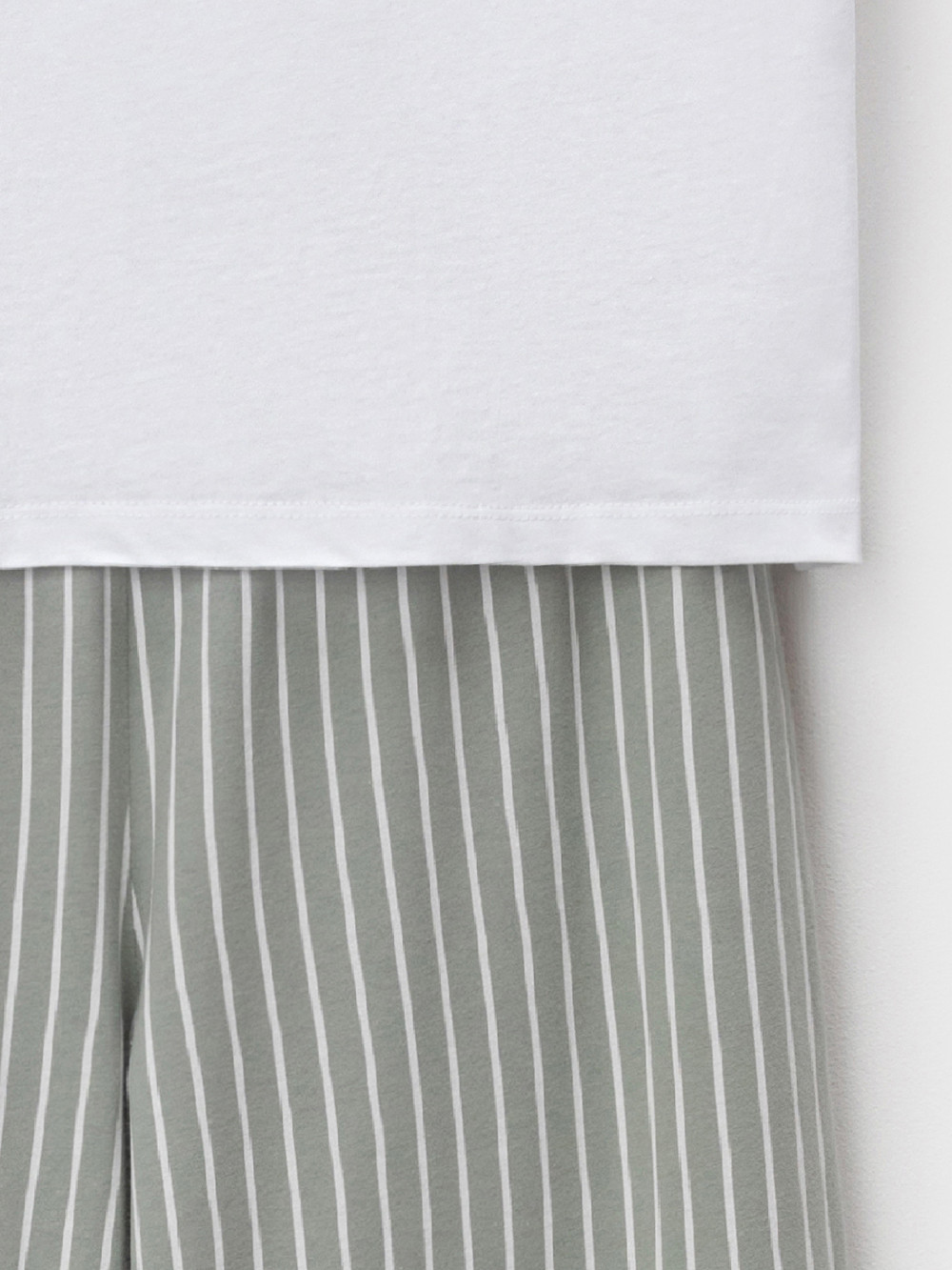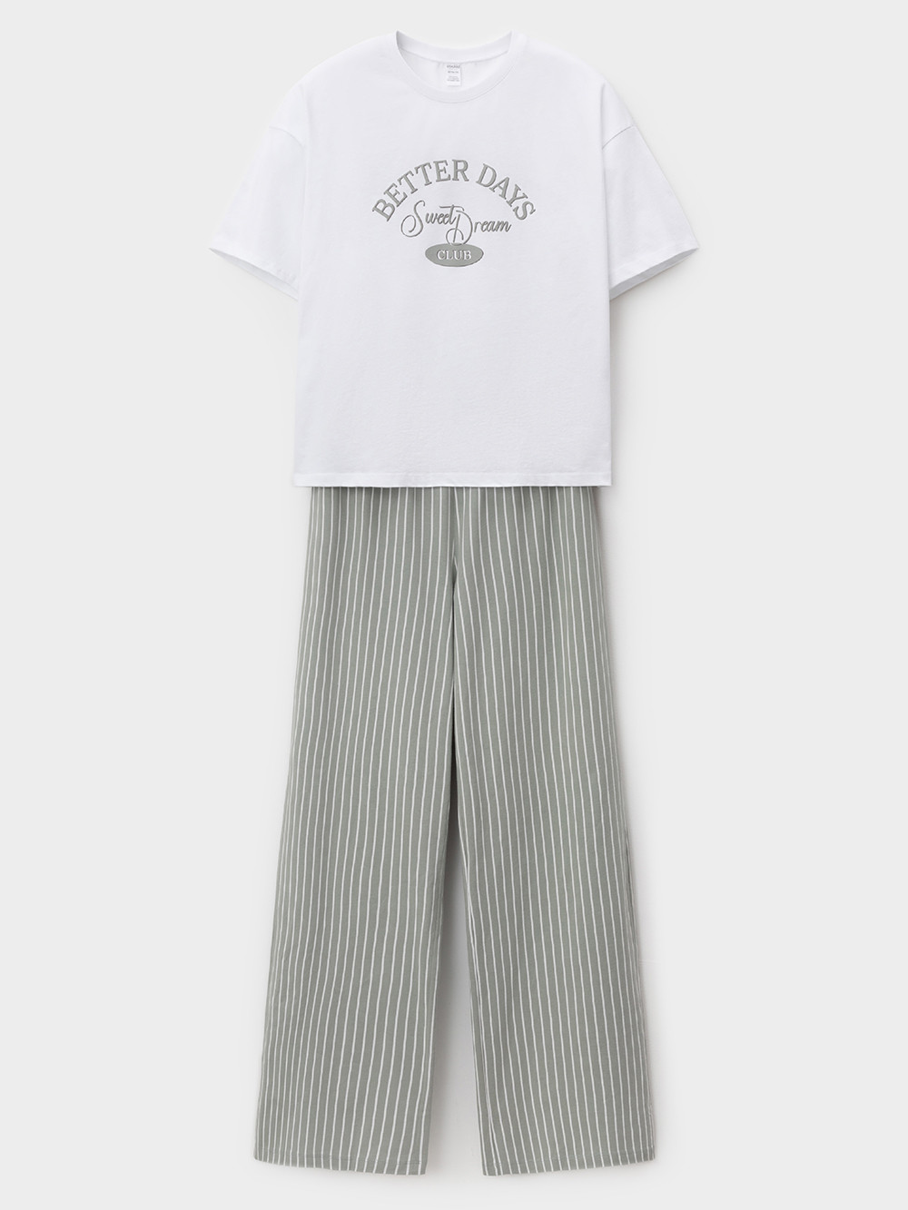 Трикотажная пижама из натурального хлопка для комфортного сна и отдыха. Свободная футболка с короткими рукавами и прямые брюки с мягкой эластичной резинкой в поясе. Гладкий материал приятен к телу, не теряет форму и позволяет коже дышать. Оригинальный принт и набивка выполнены из стойких текстильных гипоаллергенных красителей. Все трикотажные полотна производятся в соответствии с нормами швейцарского сертификата ЭкоТекс.