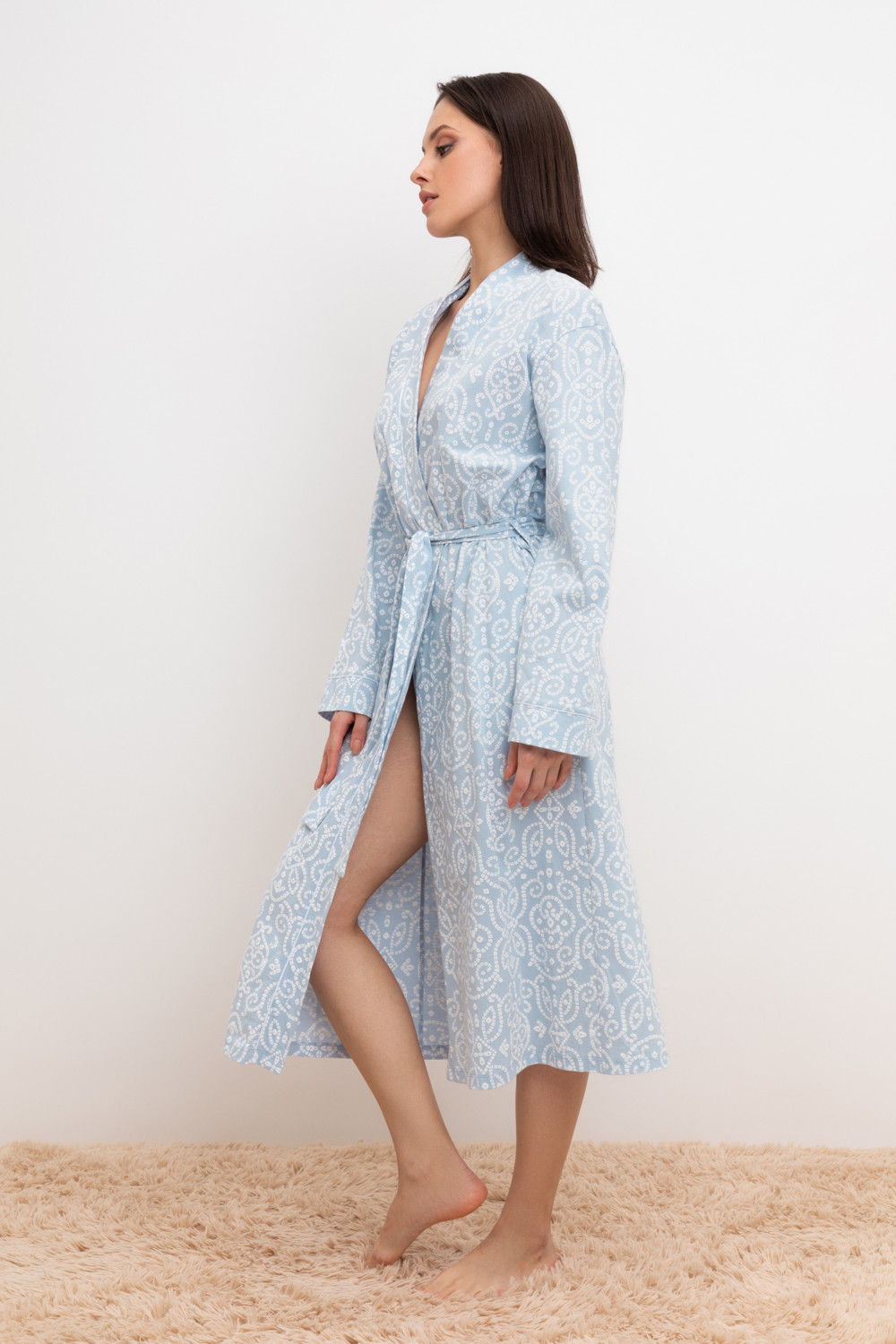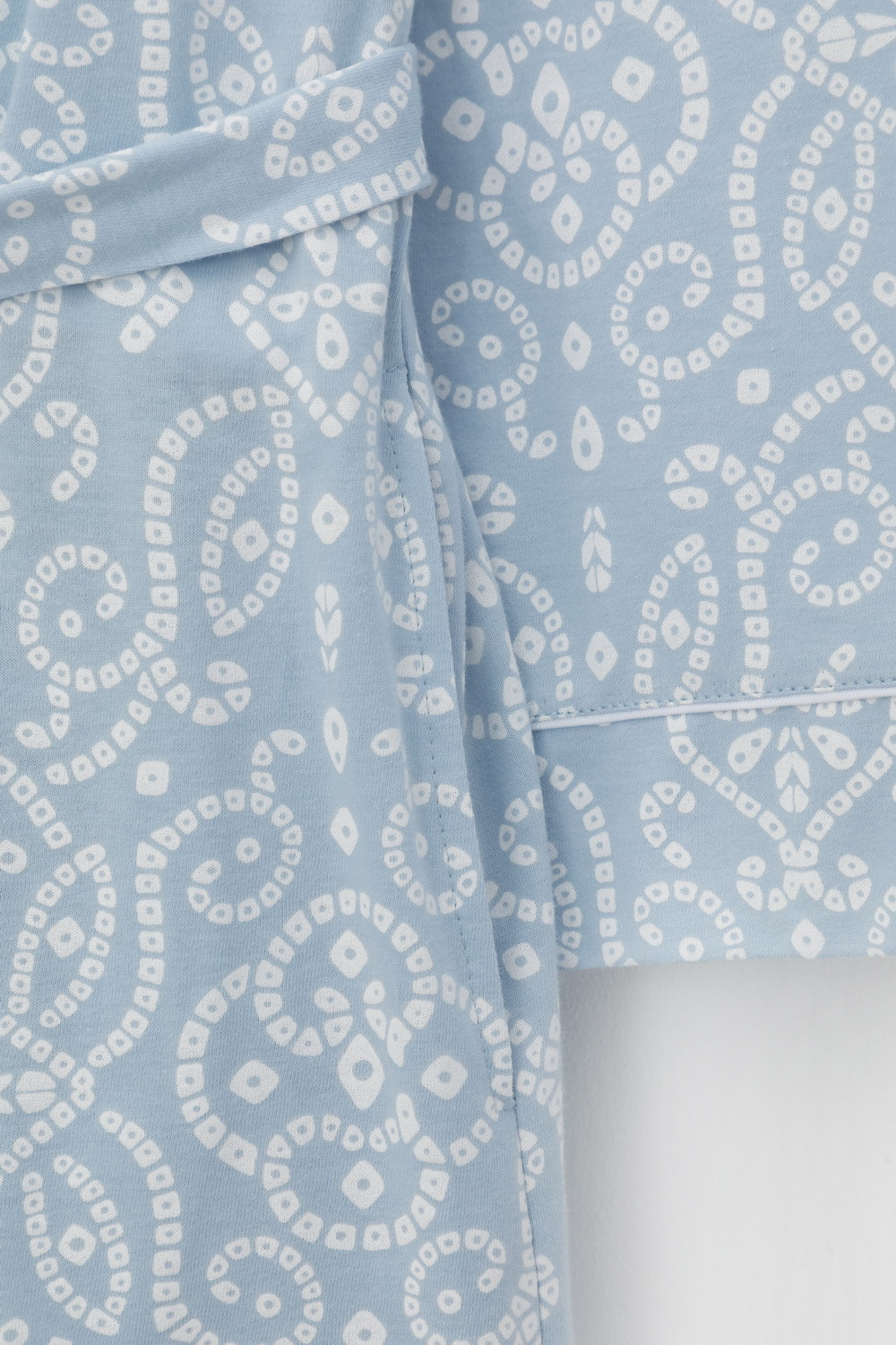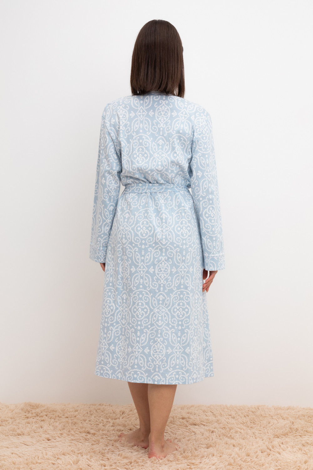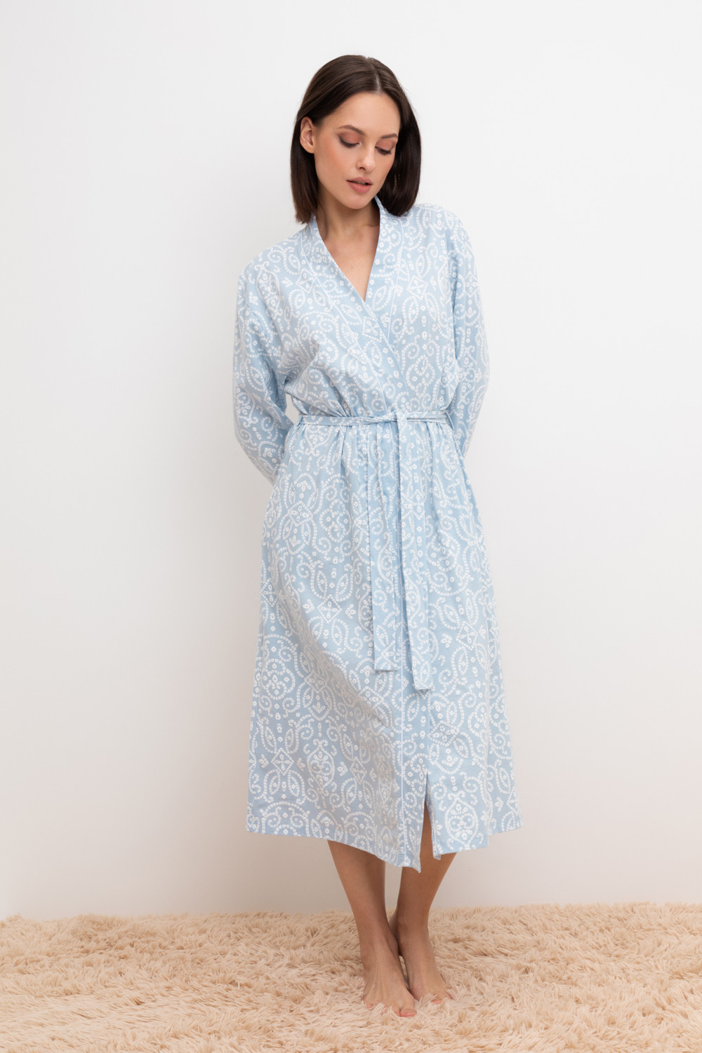Уютный легкий халат из набивного трикотажа на запах с длинными рукавами. В боковых швах два удобных кармана. С помощью пояса можно регулировать посадку и силуэт. Гладкий материал приятен к телу и позволяет коже дышать.