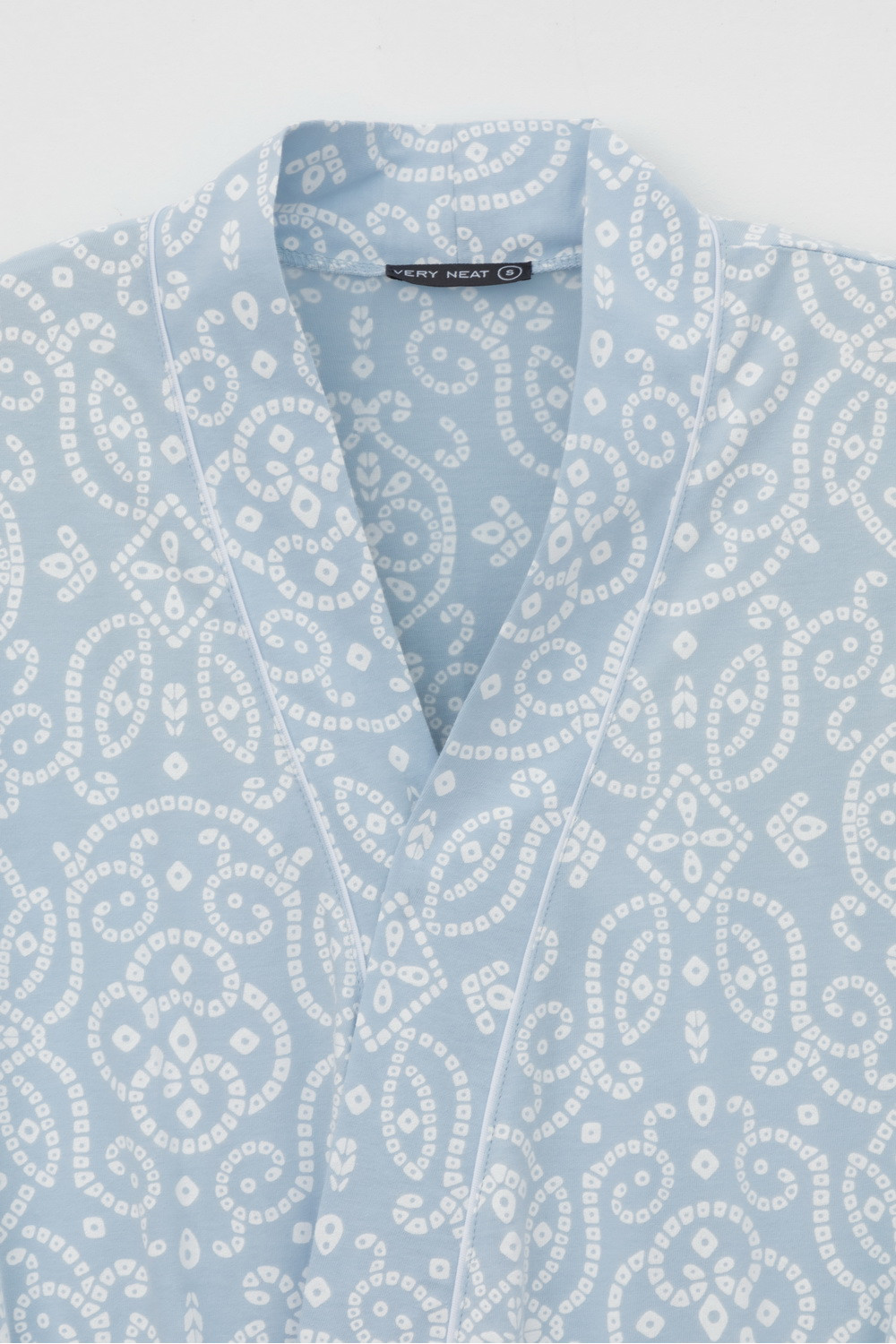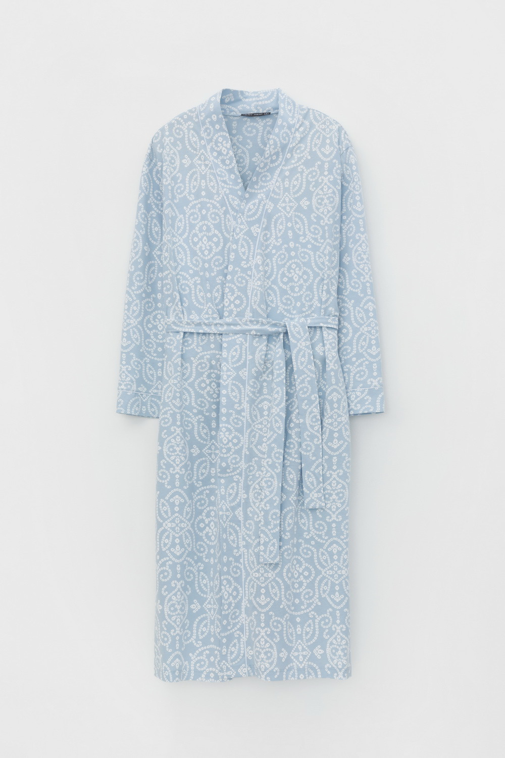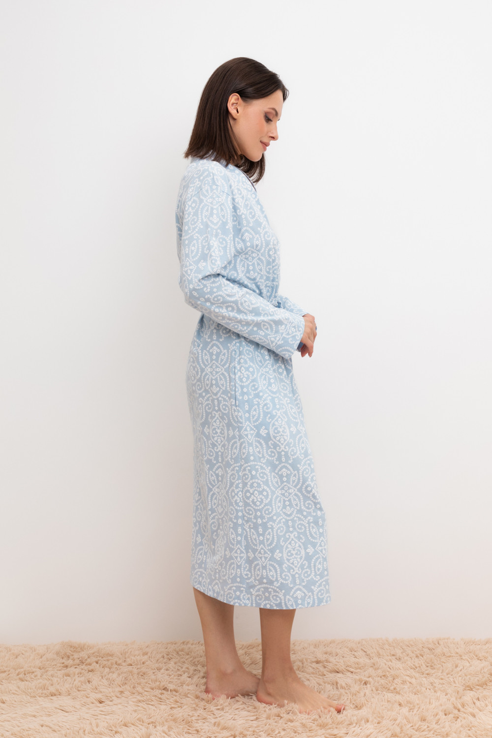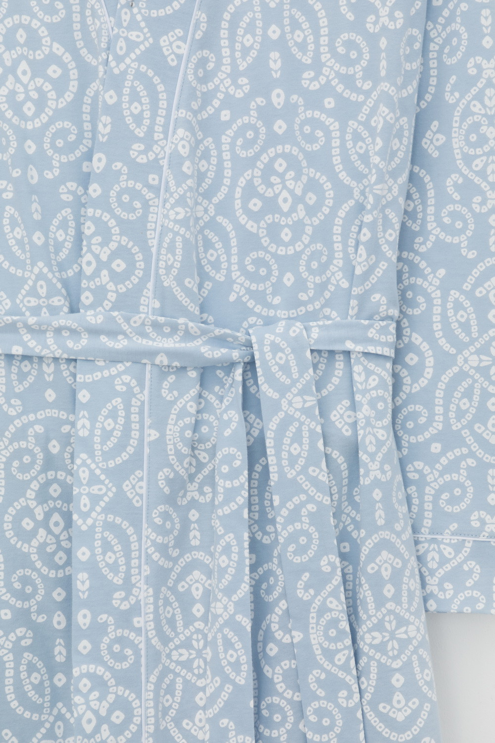 Уютный легкий халат из набивного трикотажа на запах с длинными рукавами. В боковых швах два удобных кармана. С помощью пояса можно регулировать посадку и силуэт. Гладкий материал приятен к телу и позволяет коже дышать.