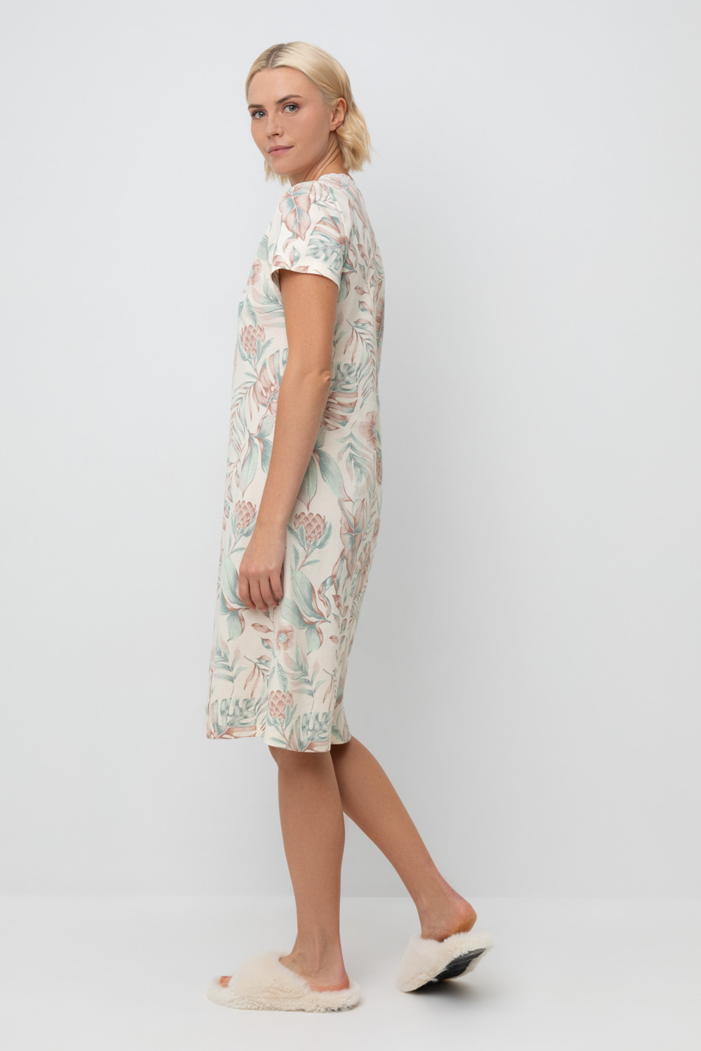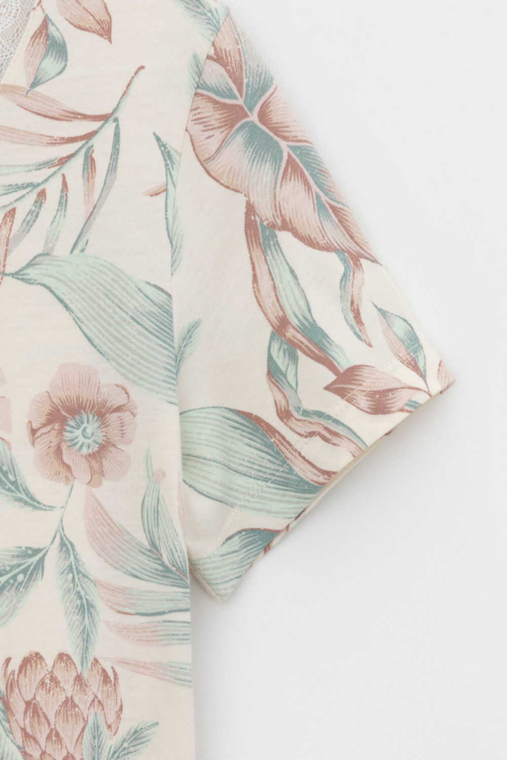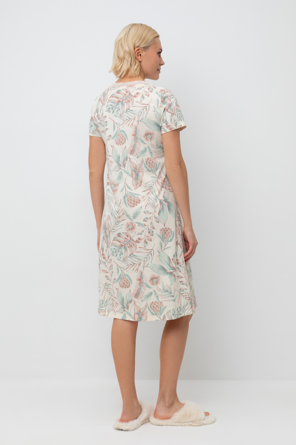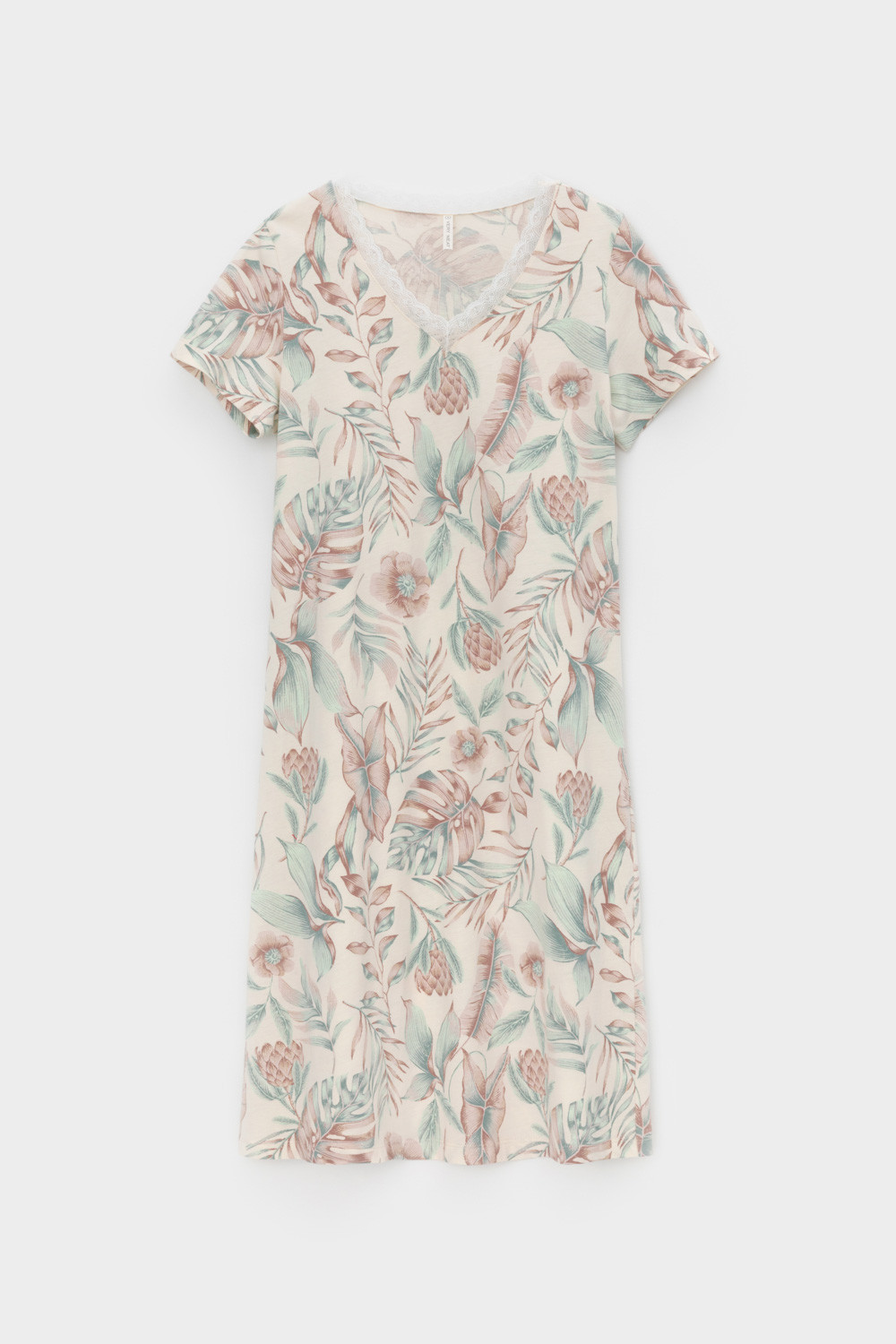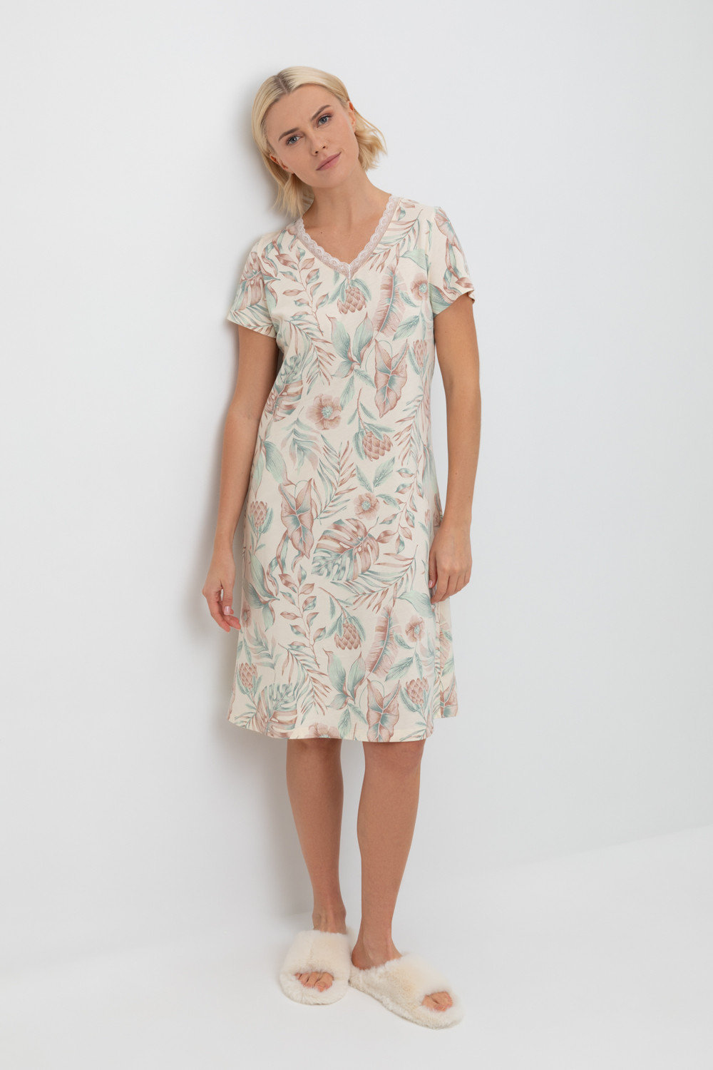 Комфортная сорочка с коротким рукавом выполнена из  высококачественного гребенного хлопка.  Эластичное кружево нежно обрамляет зону декольте, а свободный крой добавляет комфорта во время сна.