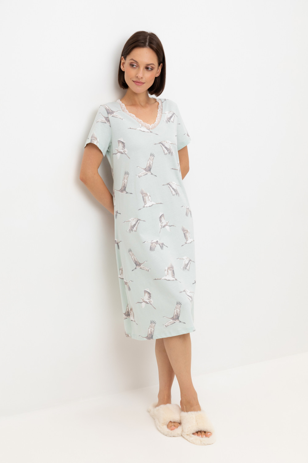Комфортная сорочка с коротким рукавом выполнена из  высококачественного гребенного хлопка.  Эластичное кружево нежно обрамляет зону декольте, а свободный крой добавляет комфорта во время сна.