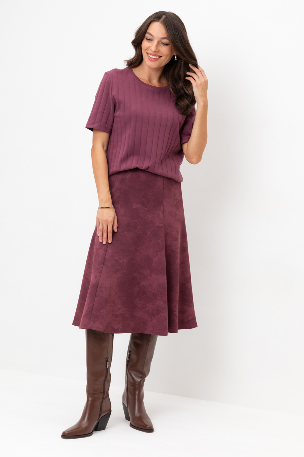 Трикотажная юбка длины миди из плотного гладкого трикотажа интерлок, произведенного из высококачественного гребенного хлопка. В составе 80% натурального хлопка и 20% полиэстера, при этом полиэстер ввязан внутрь по особой технологии и не соприкасается с кожей. Застегивается на потайную молнию. Изделие сохраняет цвет и форму после многократных стирок.