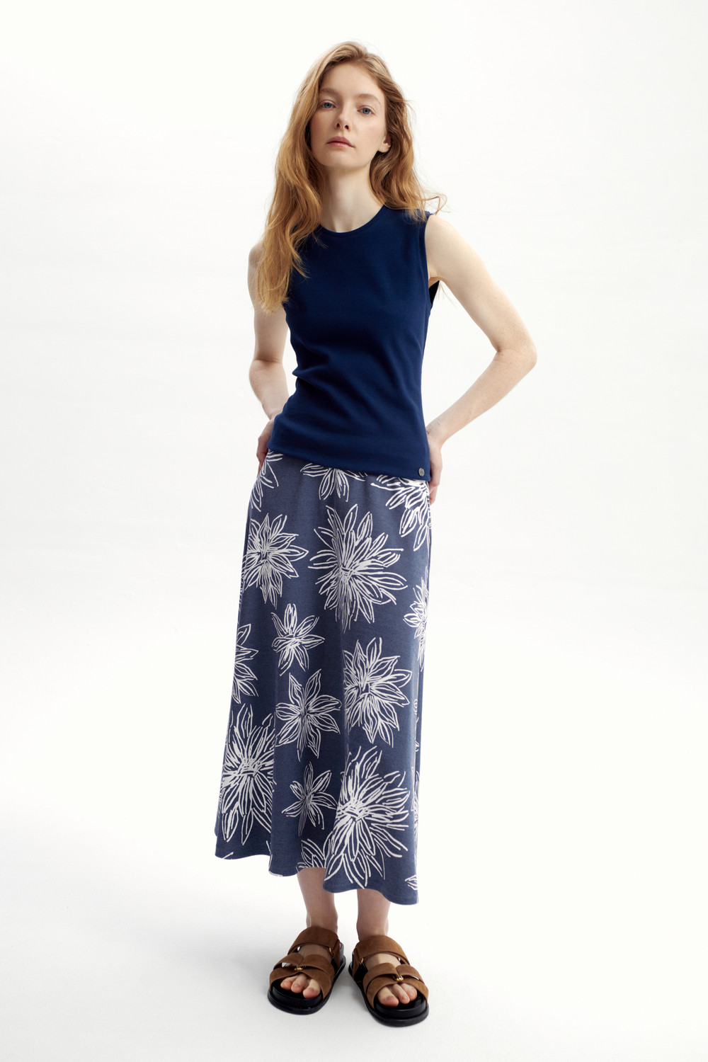 Удлиненная юбка расклешенного силуэта, изготовленная из премиального трикотажного полотна DOUBLE FACE. Мягкий на ощупь трикотаж выполнен из высококачественной гребенной пряжи, а его дизайн добавляет летнего настроения. Подберите летний образ, добавив блузу из этой коллекции.