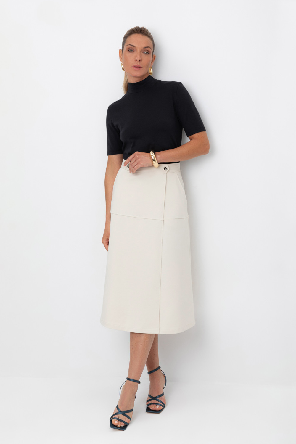 Юбка с акцентной линией талии подчеркивает утонченный силуэт. Длина миди добавляет образу сдержанной классики, делая изделие универсальным для любого случая, а имитации запаха не создает лишний объём. Юбка изготовлена из премиального трикотажа DOUBLE FACE.