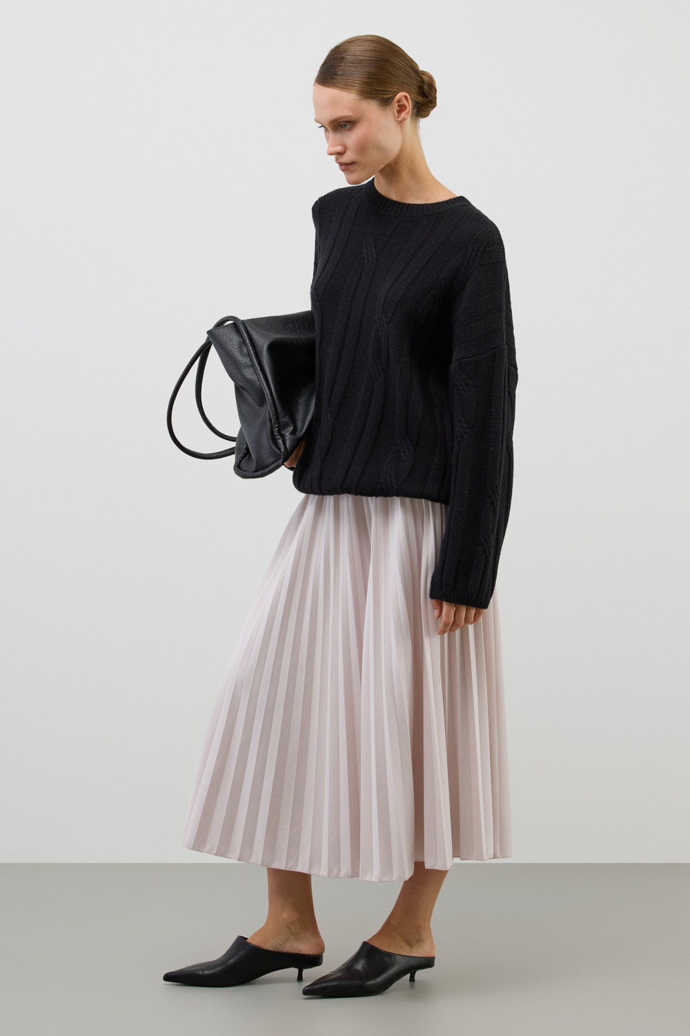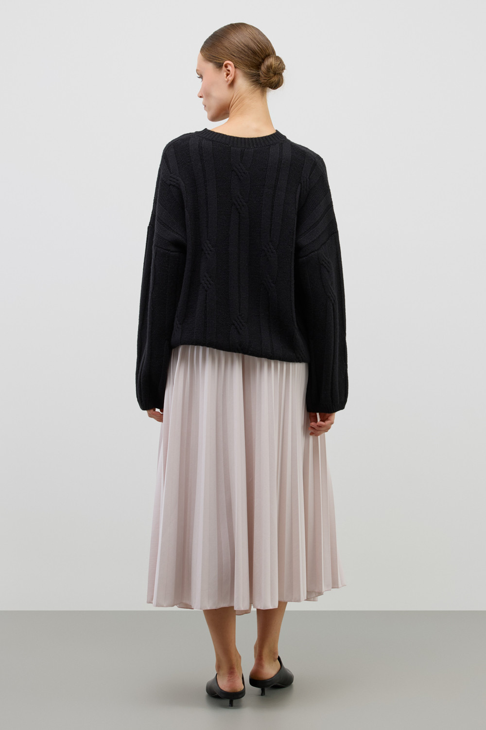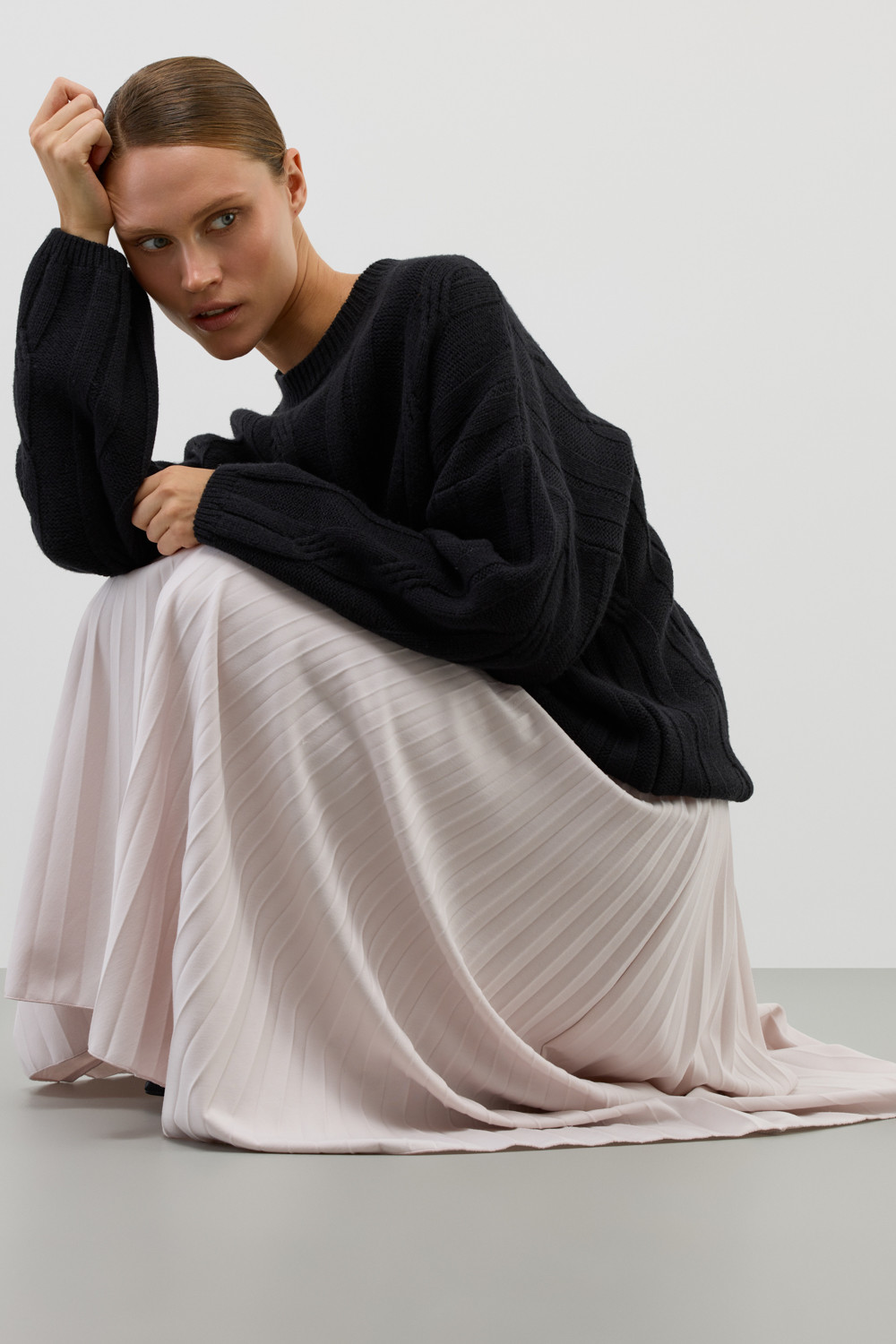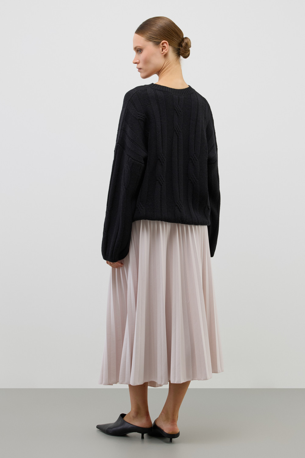 Юбка гофре, выполненная из высококачественного трикотажного полотна DOUBLE FACE, отличается особой легкостью и шелковистой текстурой благодаря силиконовой обработке ткани. Она элегантно струится, создавая ощущение легкости и воздушности. Мелкие складки визуально удлиняют силуэт, подчеркивая женственность.