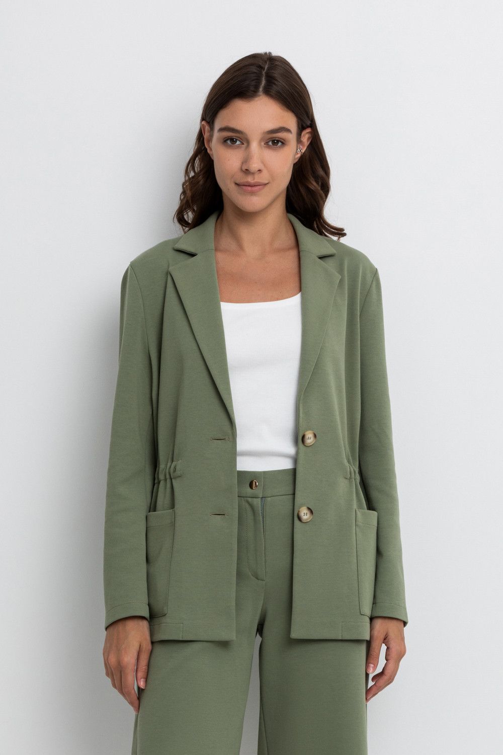 Женский жакет  прямого кроя с карманами и кулиской из плотного гладкого трикотажа интерлок. Гладкий и плотный материал на основе хлопка сохраняет форму.