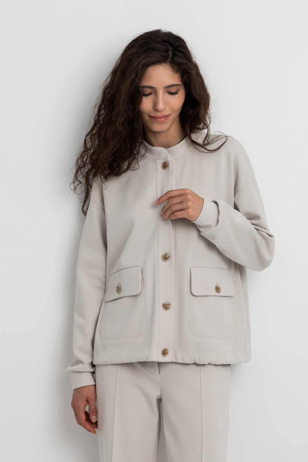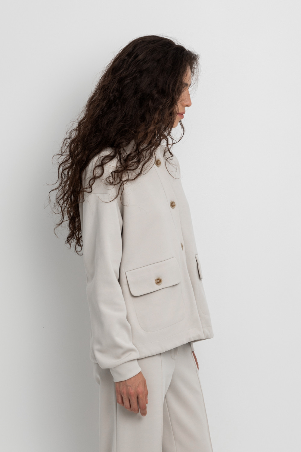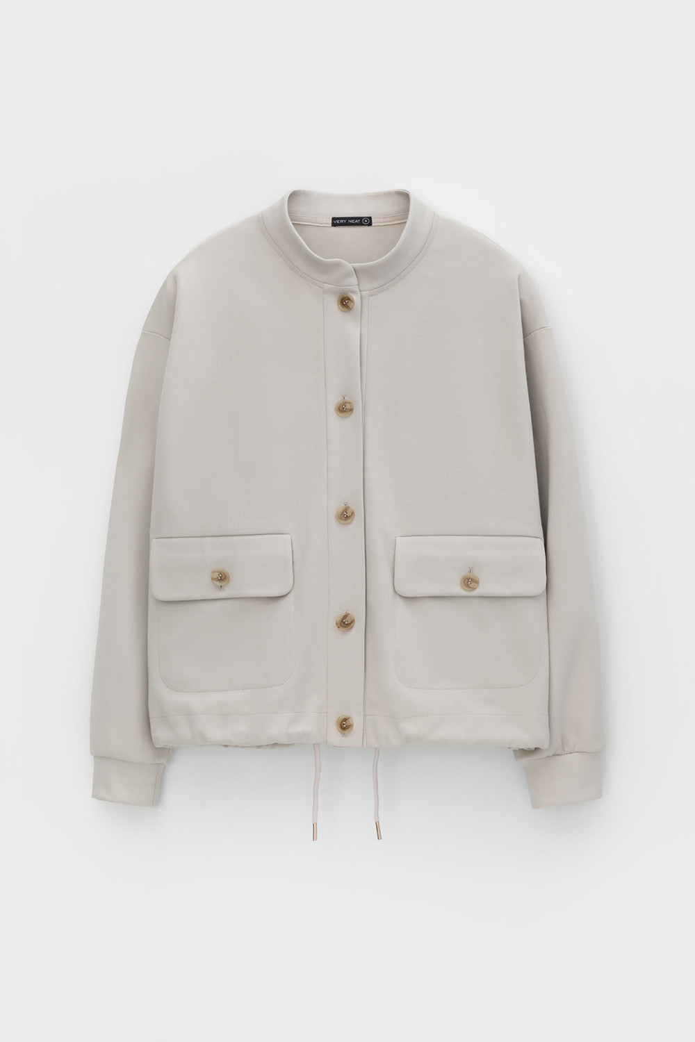 Укороченная куртка на пуговицах с карманами и кулиской по низу из плотного гладкого трикотажа интерлок. Спущенные рукава и манжеты  добавляют объем.