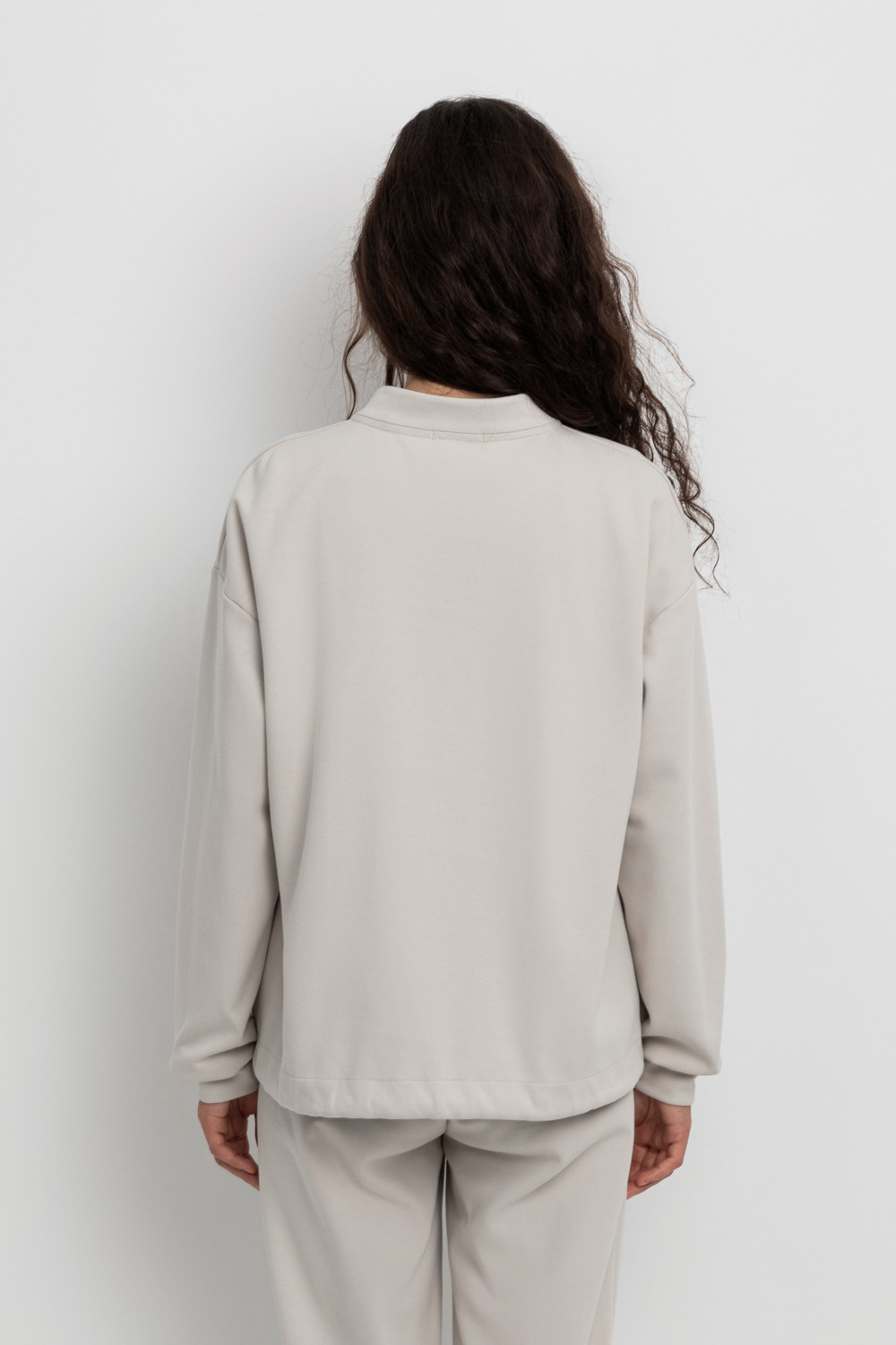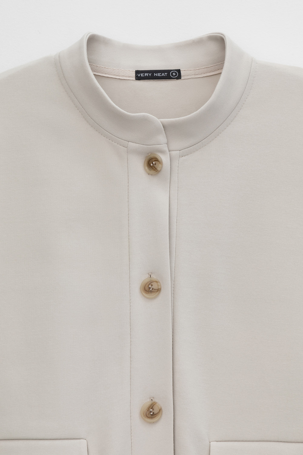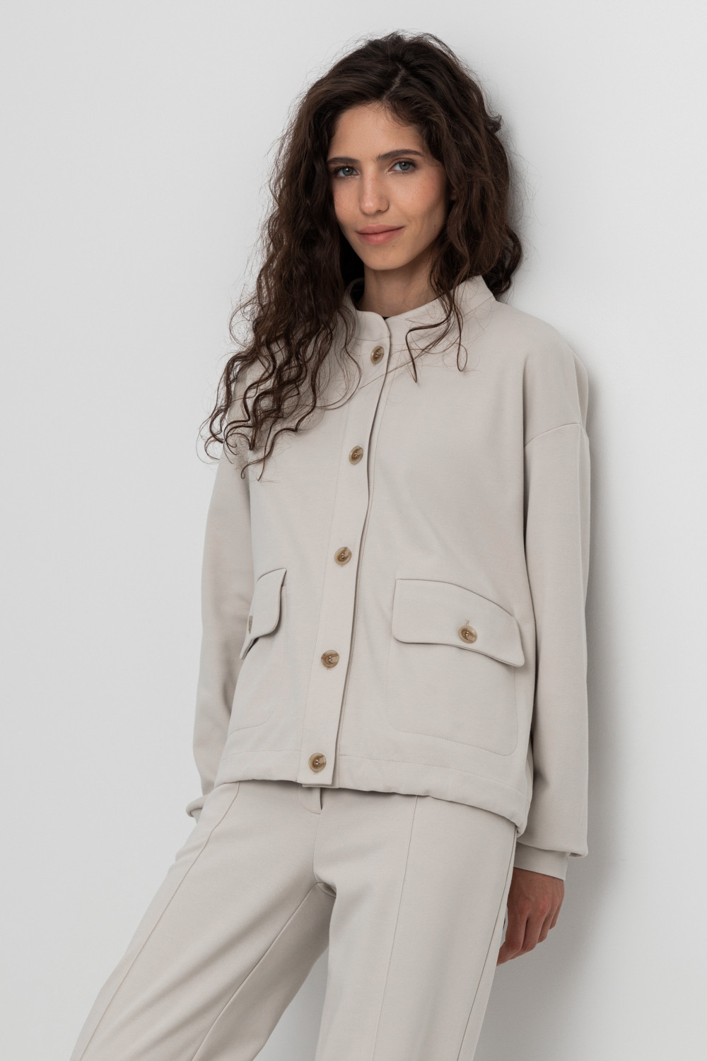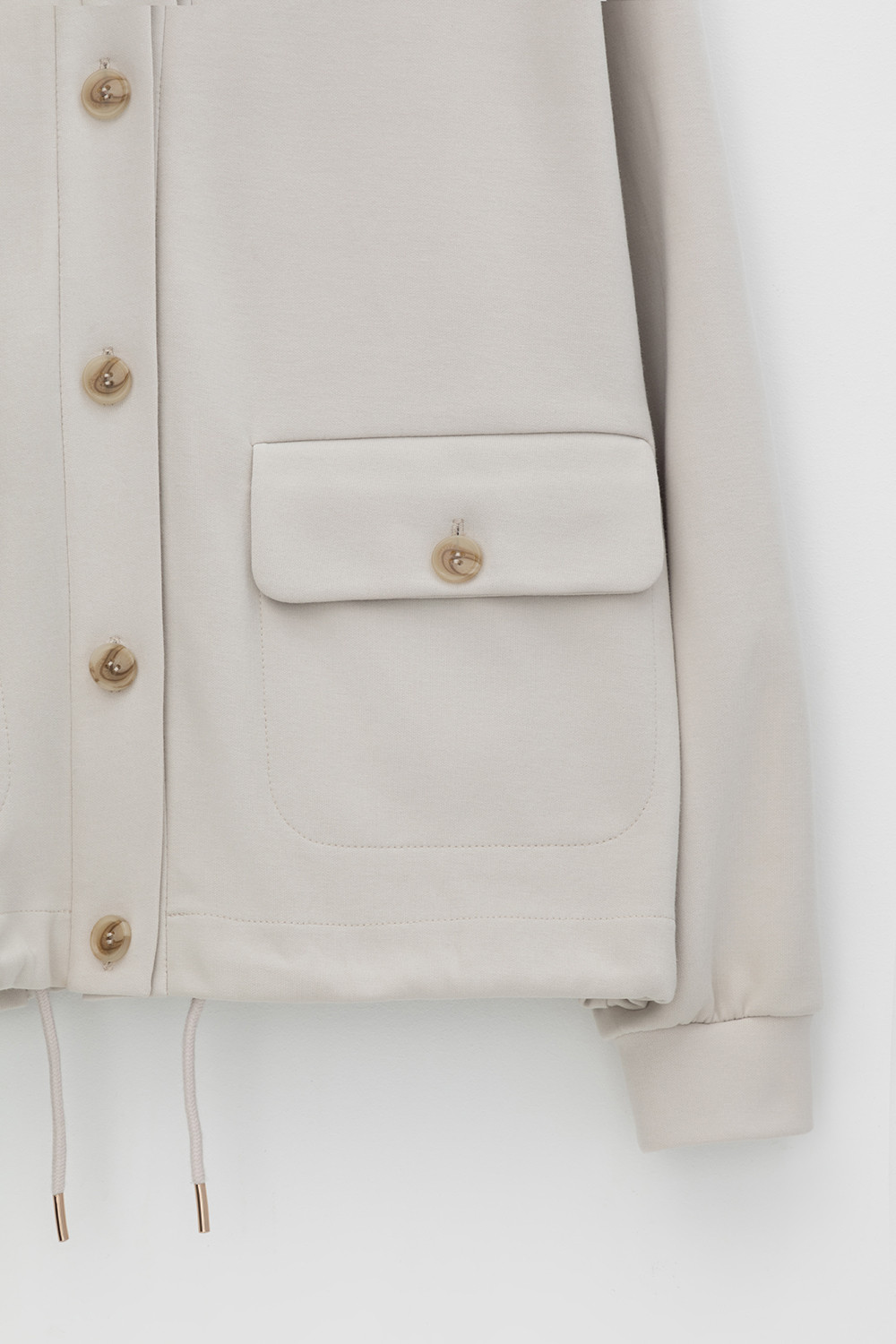 Укороченная куртка на пуговицах с карманами и кулиской по низу из плотного гладкого трикотажа интерлок. Спущенные рукава и манжеты  добавляют объем.