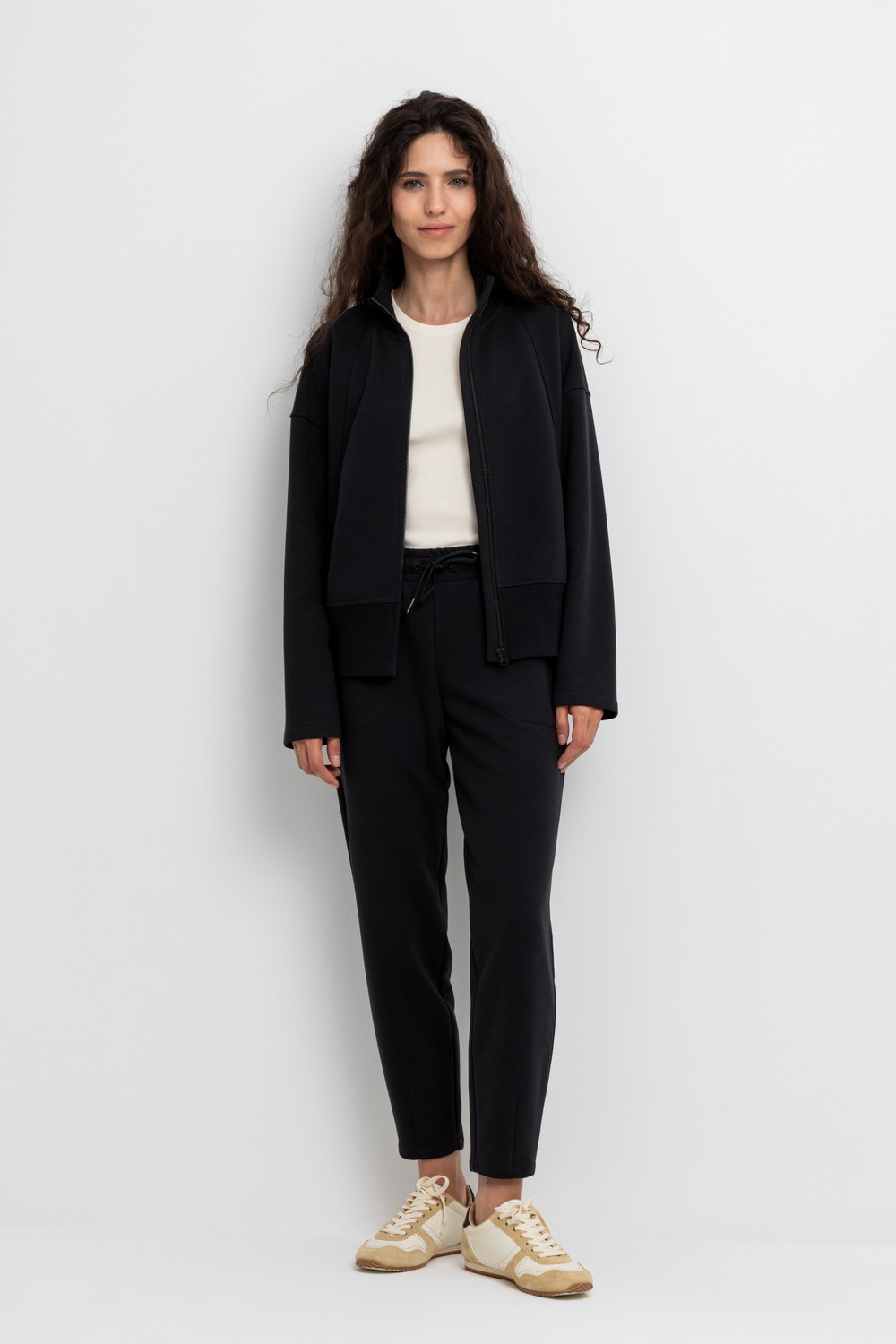 Тёплая трикотажная куртка на молнии с высоким воротником стойкой и широким поясом. Произведена из мягкого трикотажного футера трёхнитки. В составе 80% натурального хлопка и 20% полиэстера, при этом полиэстер ввязан внутрь по особой технологии и не соприкасается с кожей.