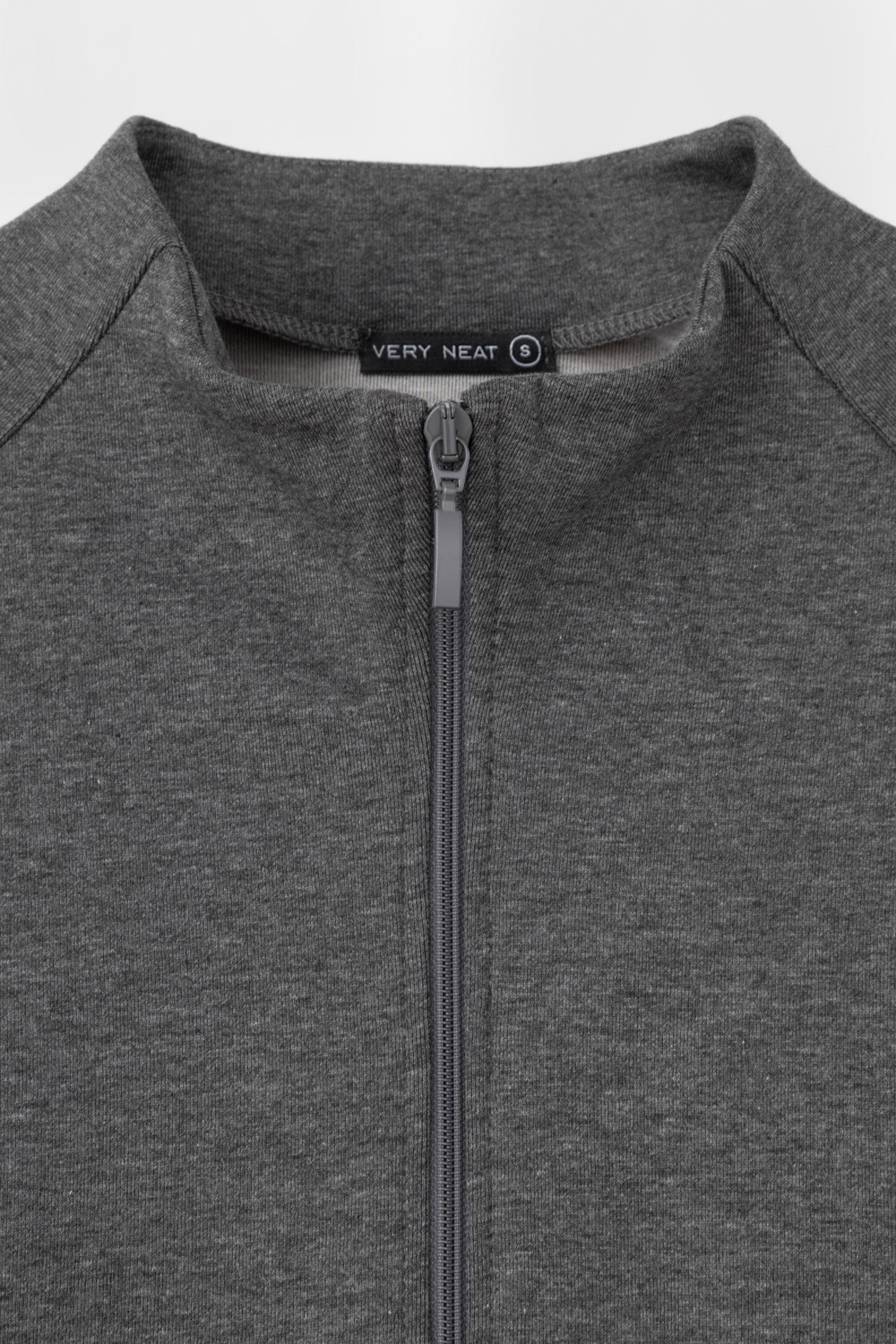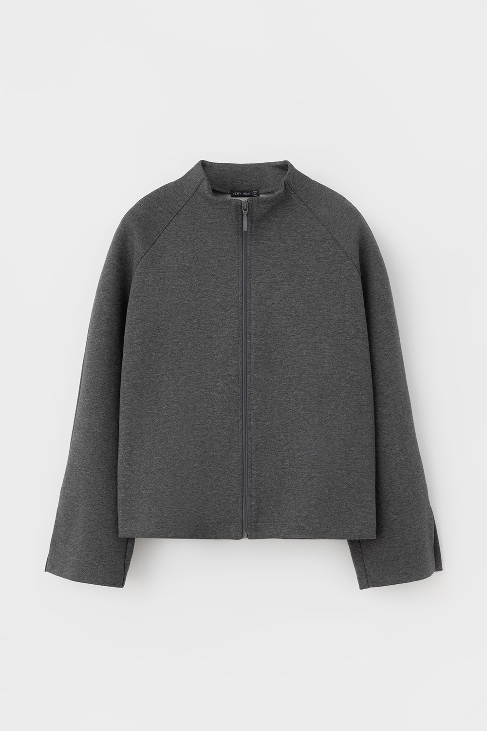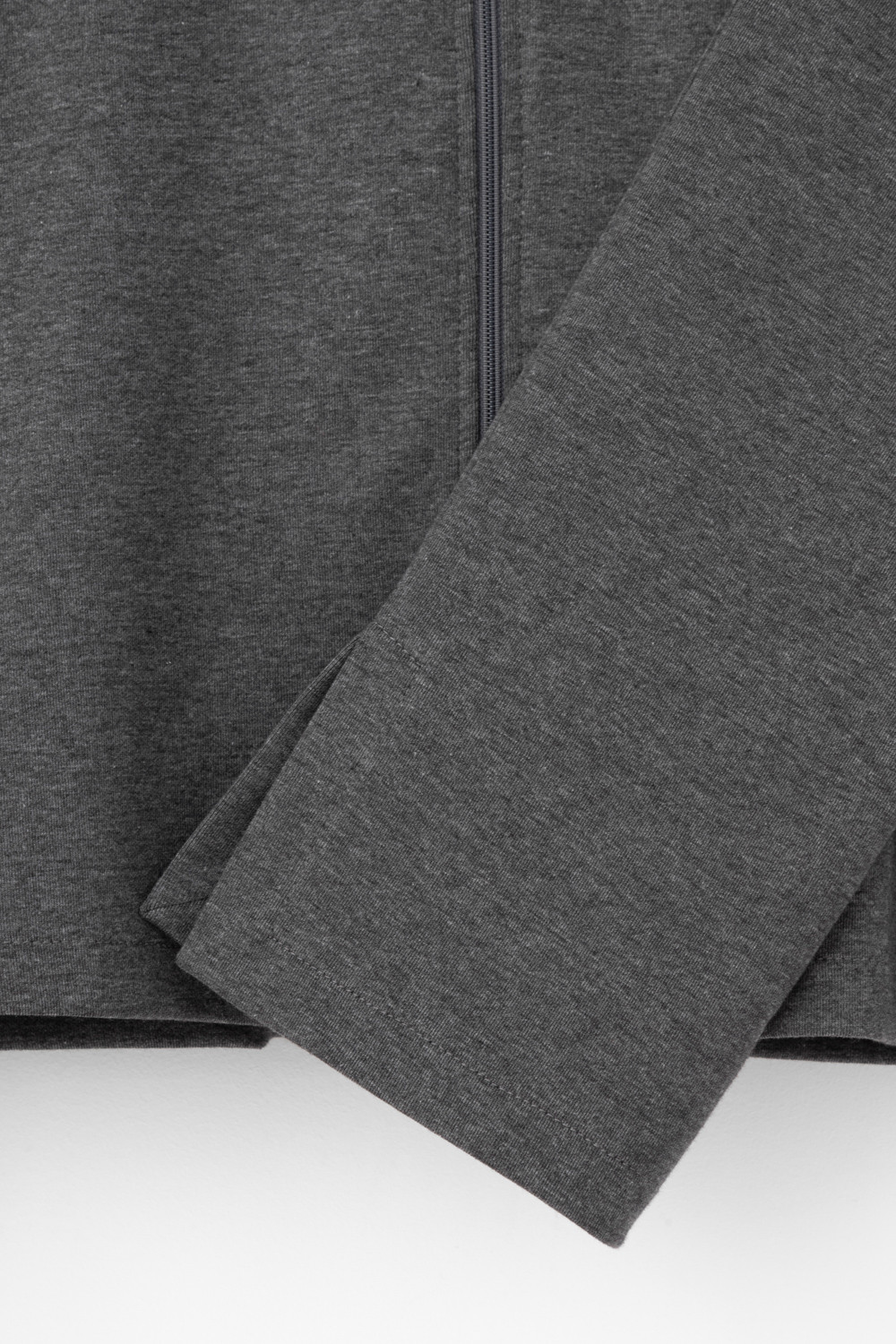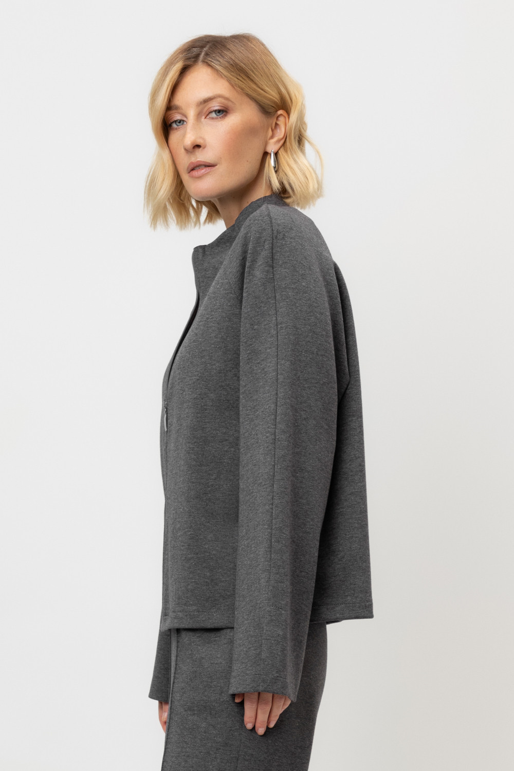 Жакет на молнии с воротником-стойкой, выполненный из плотного гладкого трикотажа интерлок. В составе 80% натурального хлопка и 20% полиэстера, при этом полиэстер ввязан внутрь по особой технологии и не соприкасается с кожей. Рукава с разрезами.