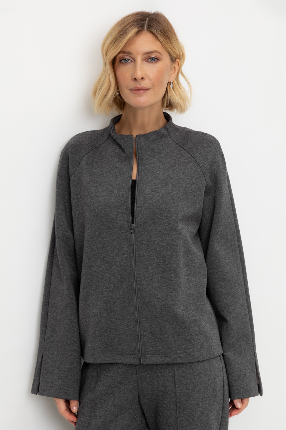 Жакет на молнии с воротником-стойкой, выполненный из плотного гладкого трикотажа интерлок. В составе 80% натурального хлопка и 20% полиэстера, при этом полиэстер ввязан внутрь по особой технологии и не соприкасается с кожей. Рукава с разрезами.
