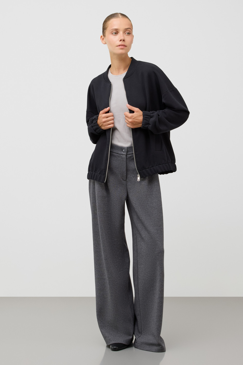 Куртка, выполненная из петельчатого футера трехнитки, отличается особой текстурой и комфортом. За счет фактуры переплетения и специальных обработок сохраняет силуэт и форму, что позволяет сочетать его как с юбкой, так и с брюками. Хлопок в составе добавит комфорта при носке.