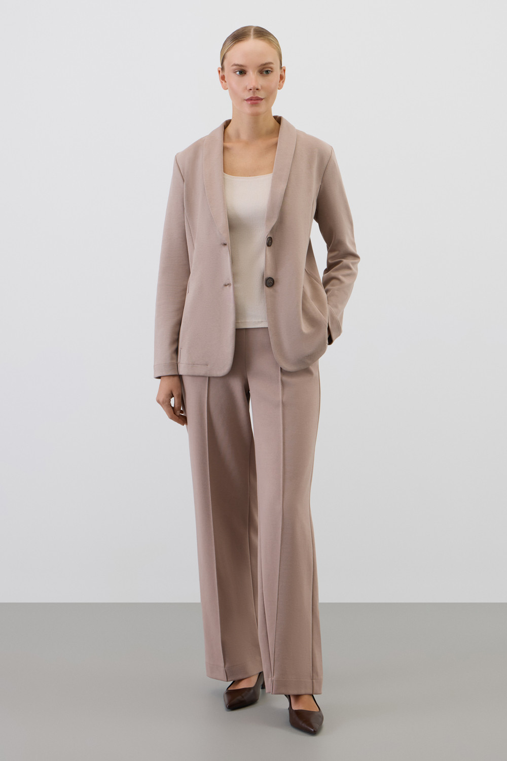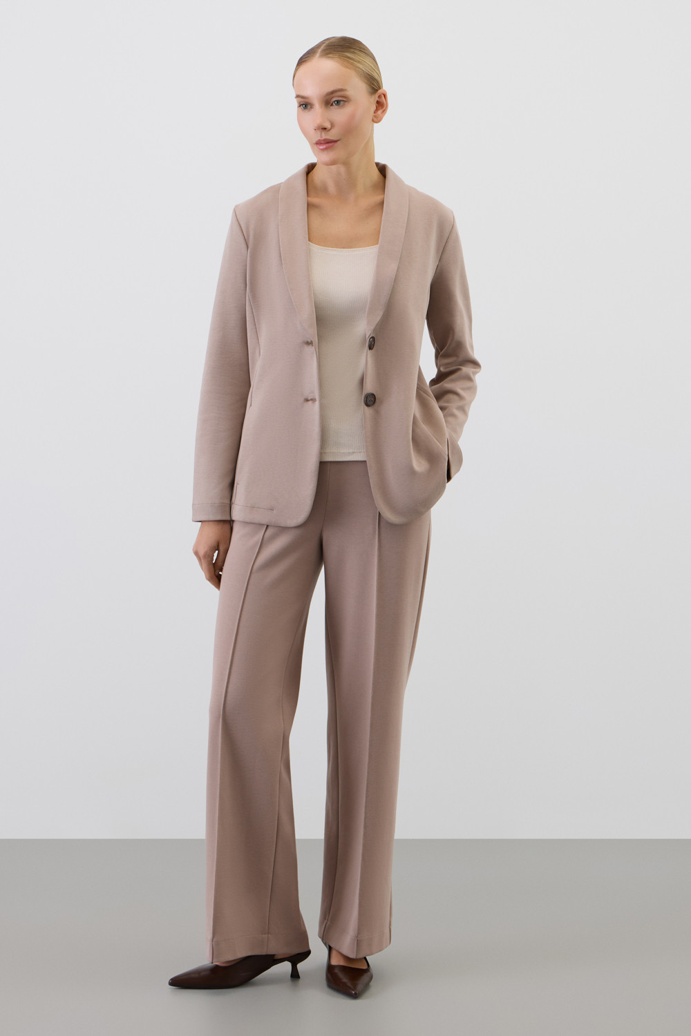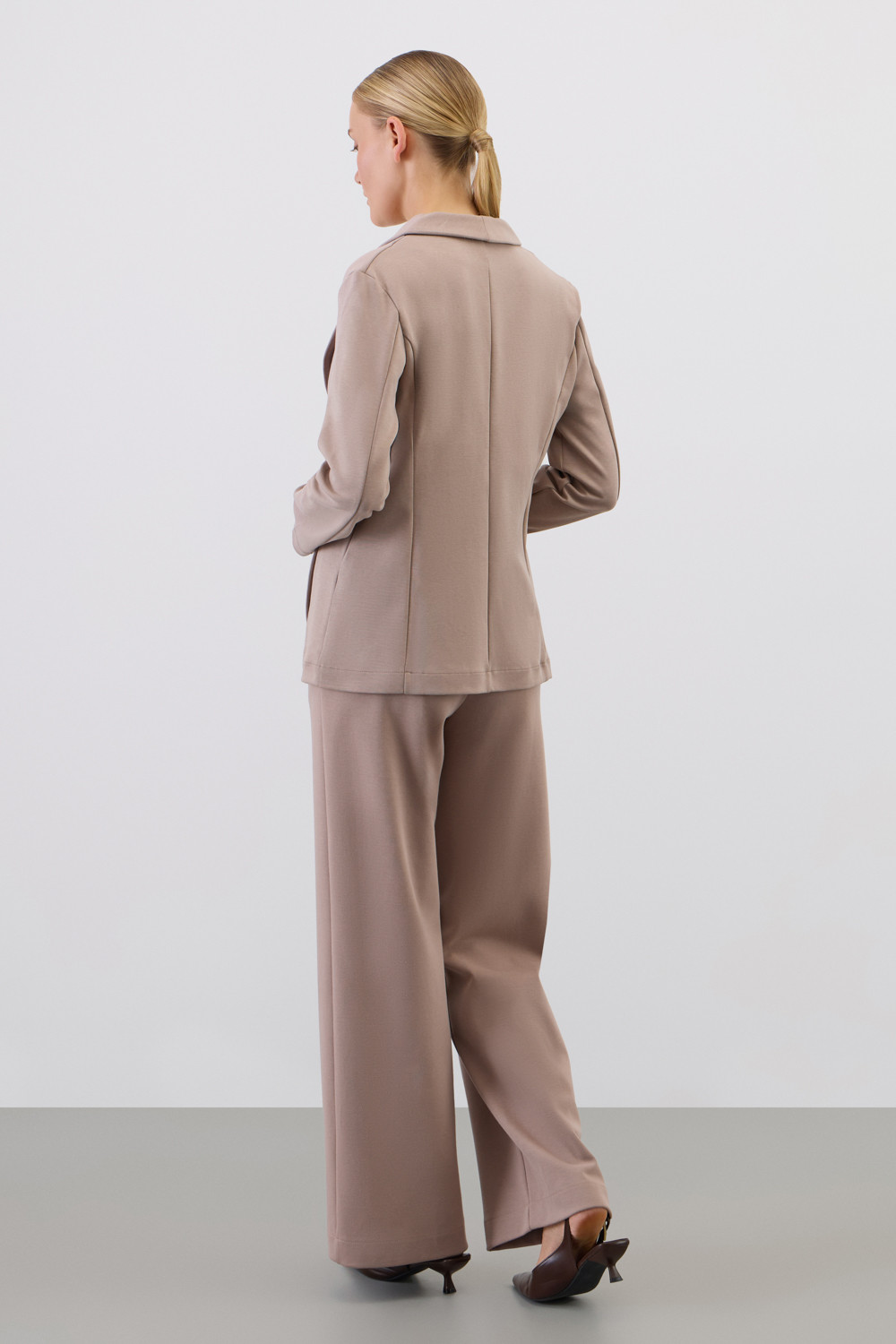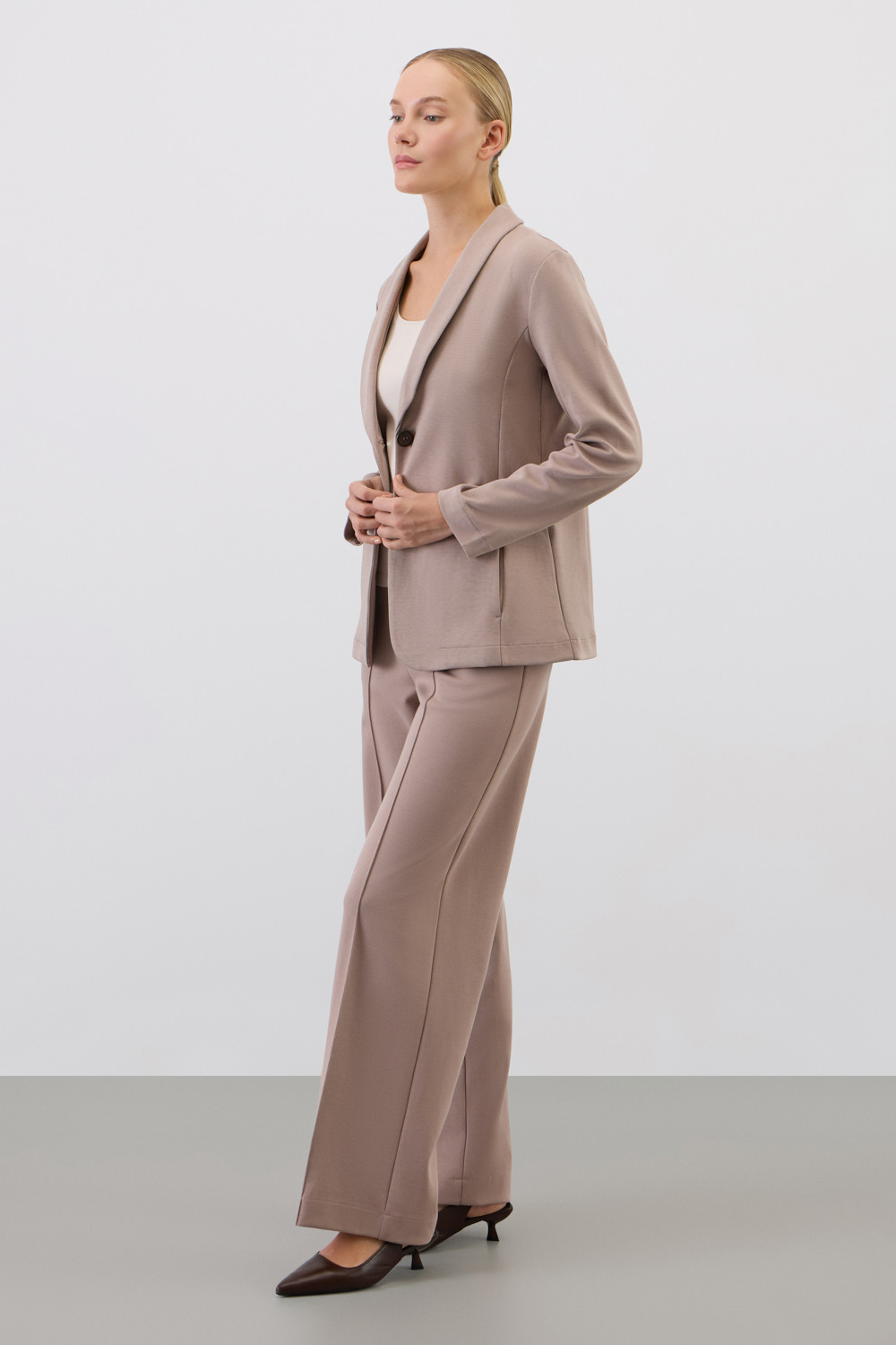 Приталенный пиджак изготовлен из высококачественного трикотажного полотна DOUBLE FACE. Трикотаж прошел специальную каучуковую обработку, что придает пиджаку легкость и шелковистую текстуру. Благодаря уникальному переплетению и специальным методам обработки, он сохраняет свой силуэт и форму, что позволяет легко комбинировать его как с юбками, так и с брюками.