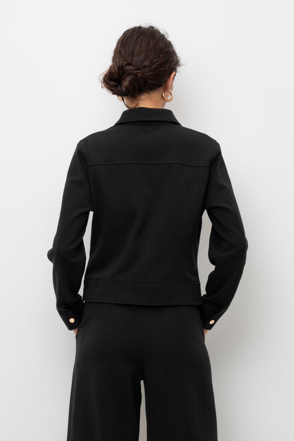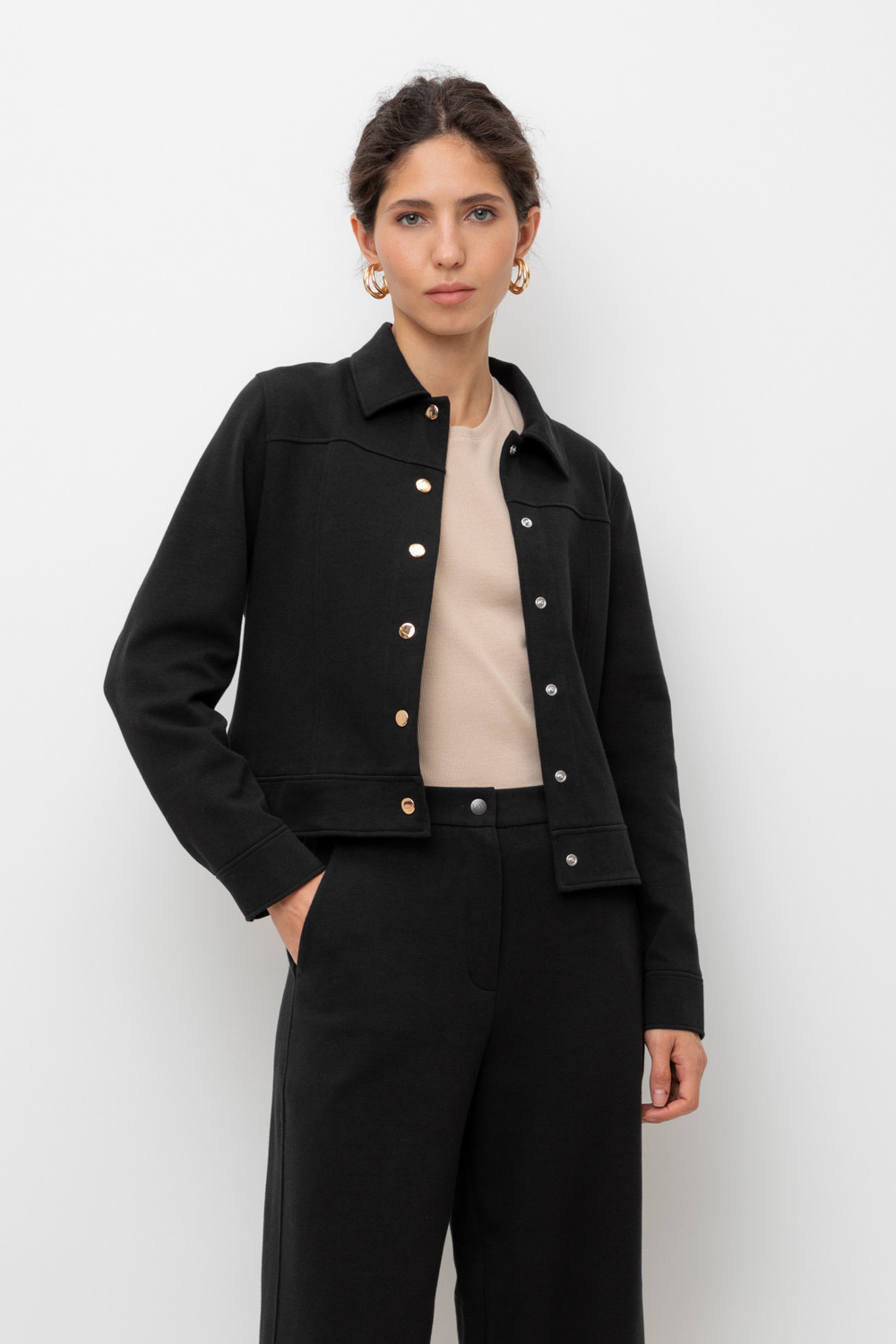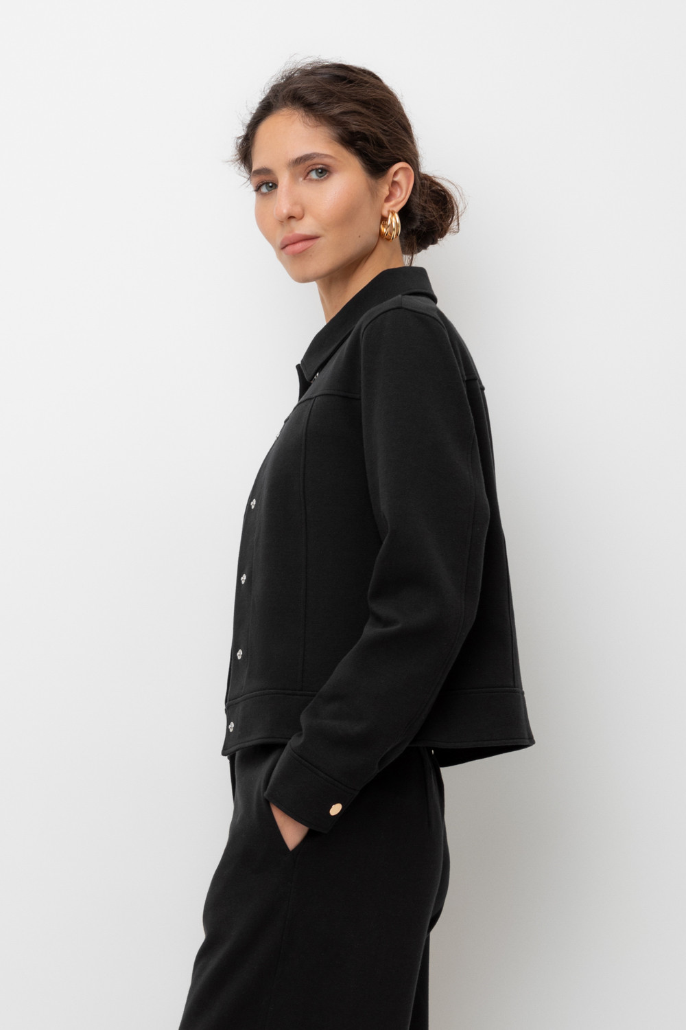 Укорочённый жакет, изготовленный из премиального трикотажного полотна DOUBLE FACE с добавлением спандекса. За счет фактуры переплетения и специальных обработок сохраняет силуэт и форму, что позволяет сочетать его как с юбкой, так и с брюками. Хлопок в составе добавит комфорта при носке.