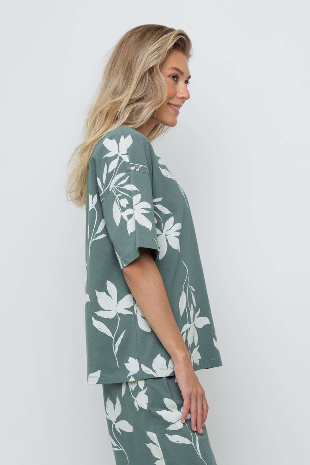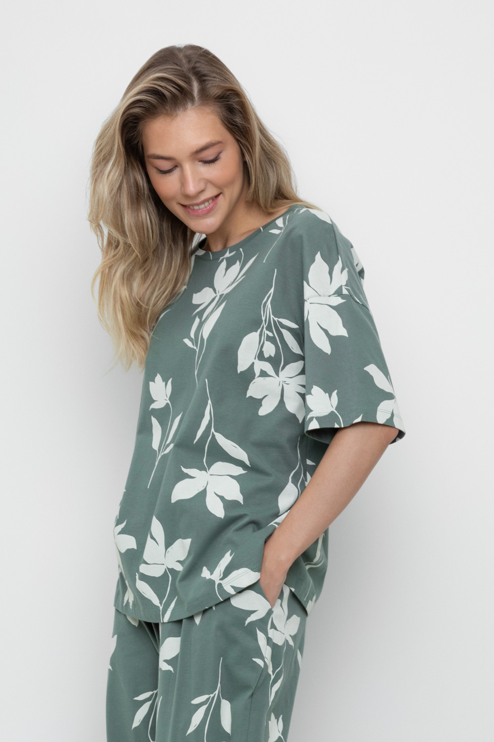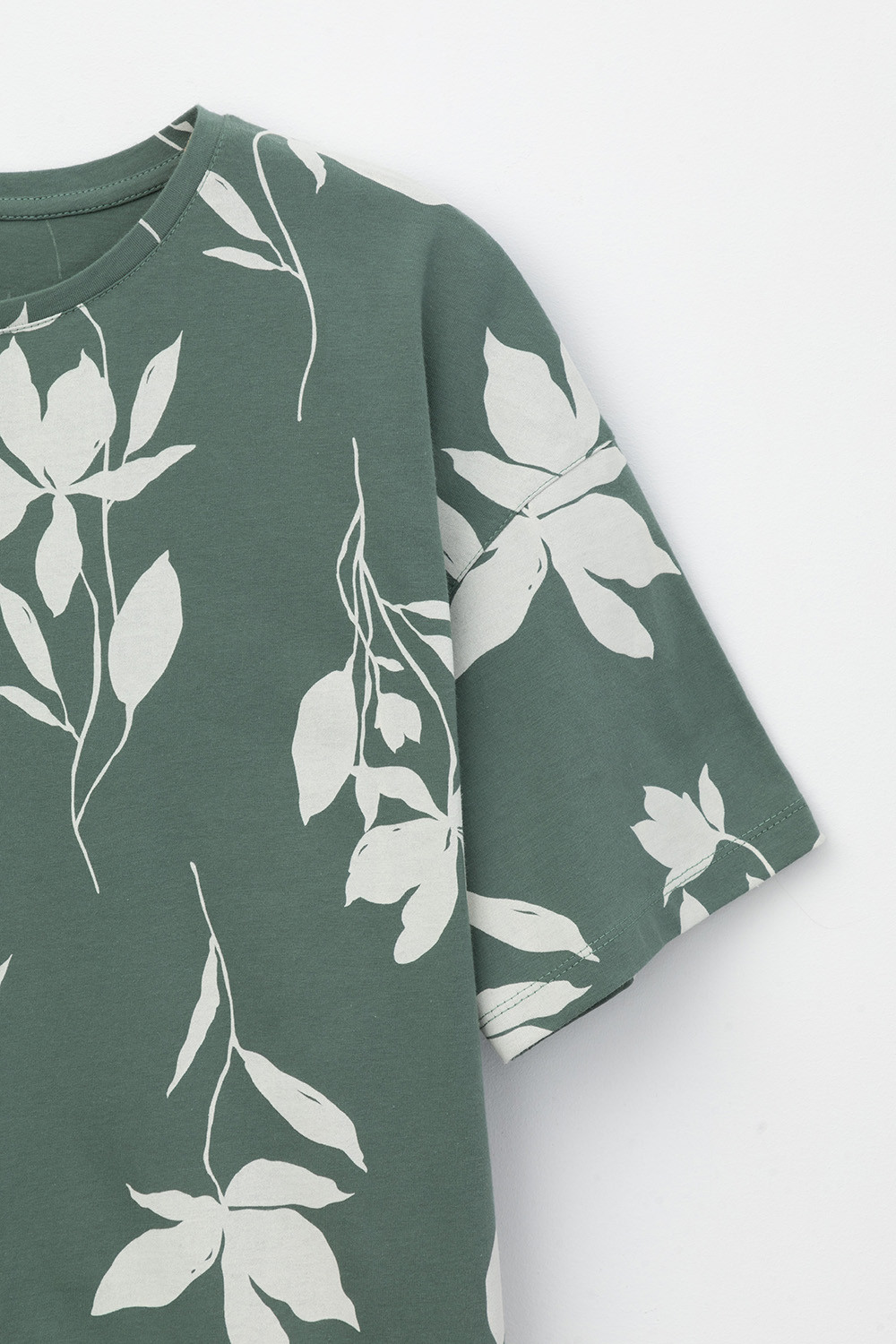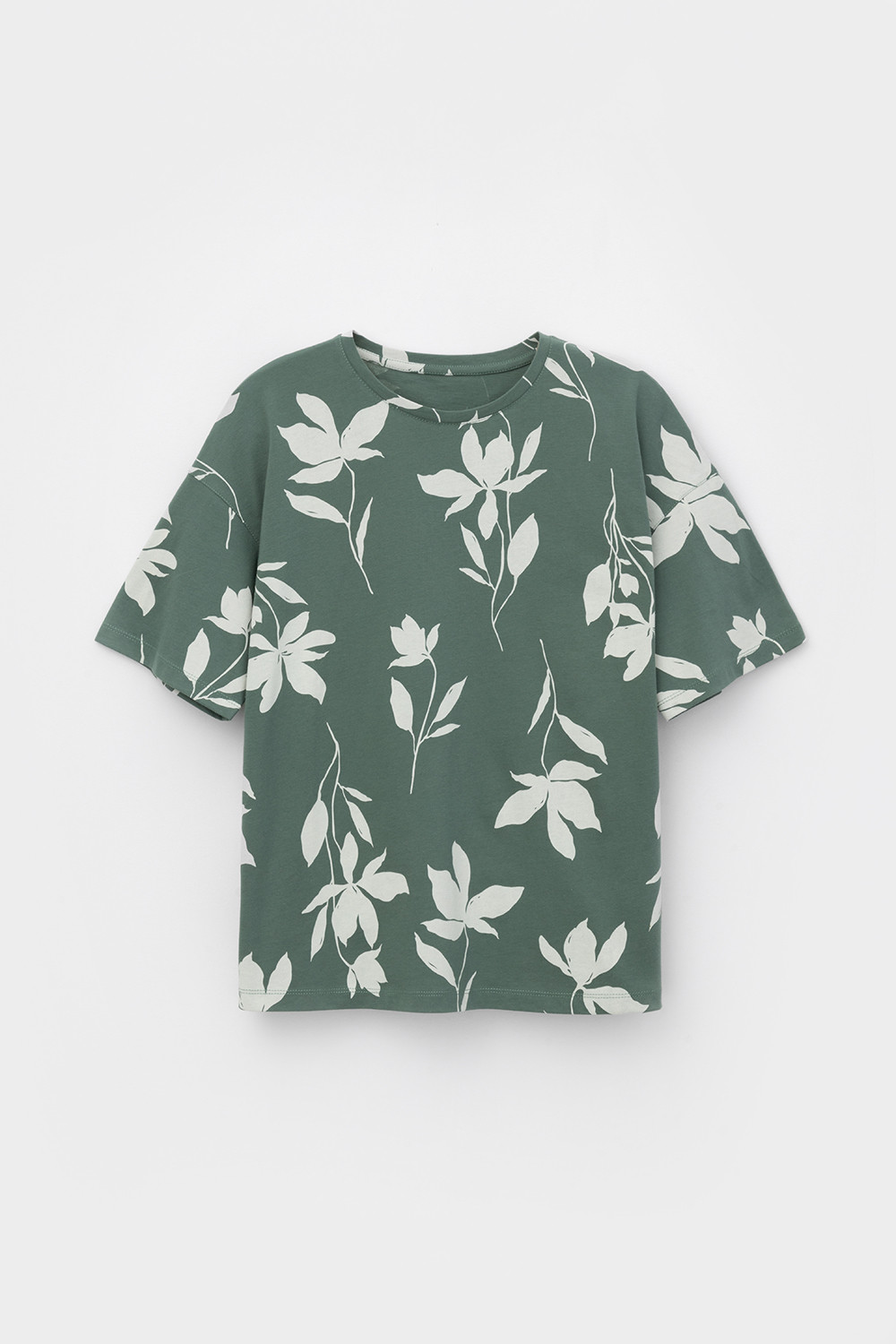 Свободная футболка из набивного трикотажа супрем. Спущенное плечо придает изделию свободный силуэт.