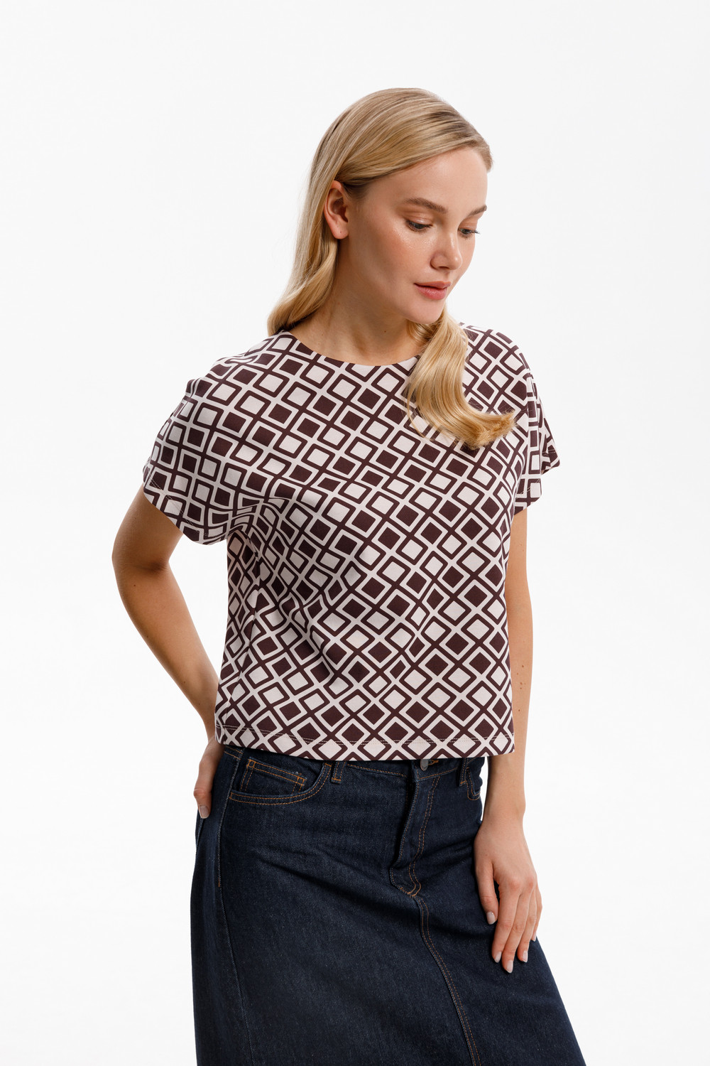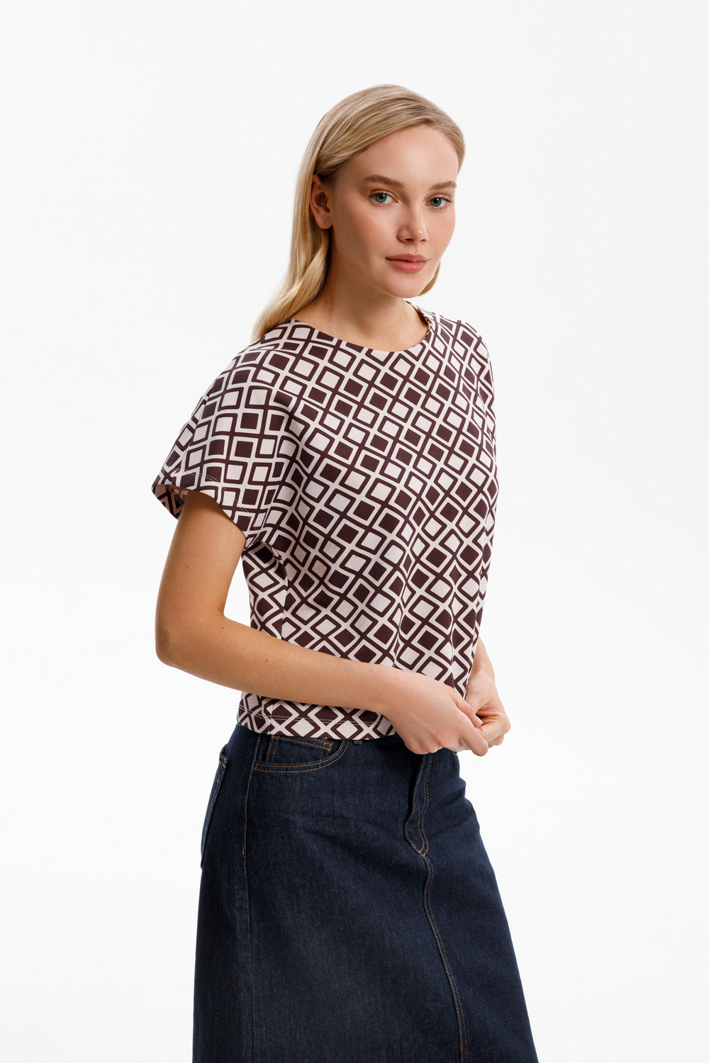 Блуза, изготовленная из премиального трикотажа DOUBLE FACE, дарит ощущение комфорта и легкости. Немного укороченная длина хорошо сочетается с брюками свободного силуэта из этой же коллекции.