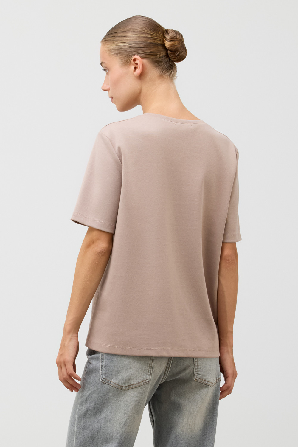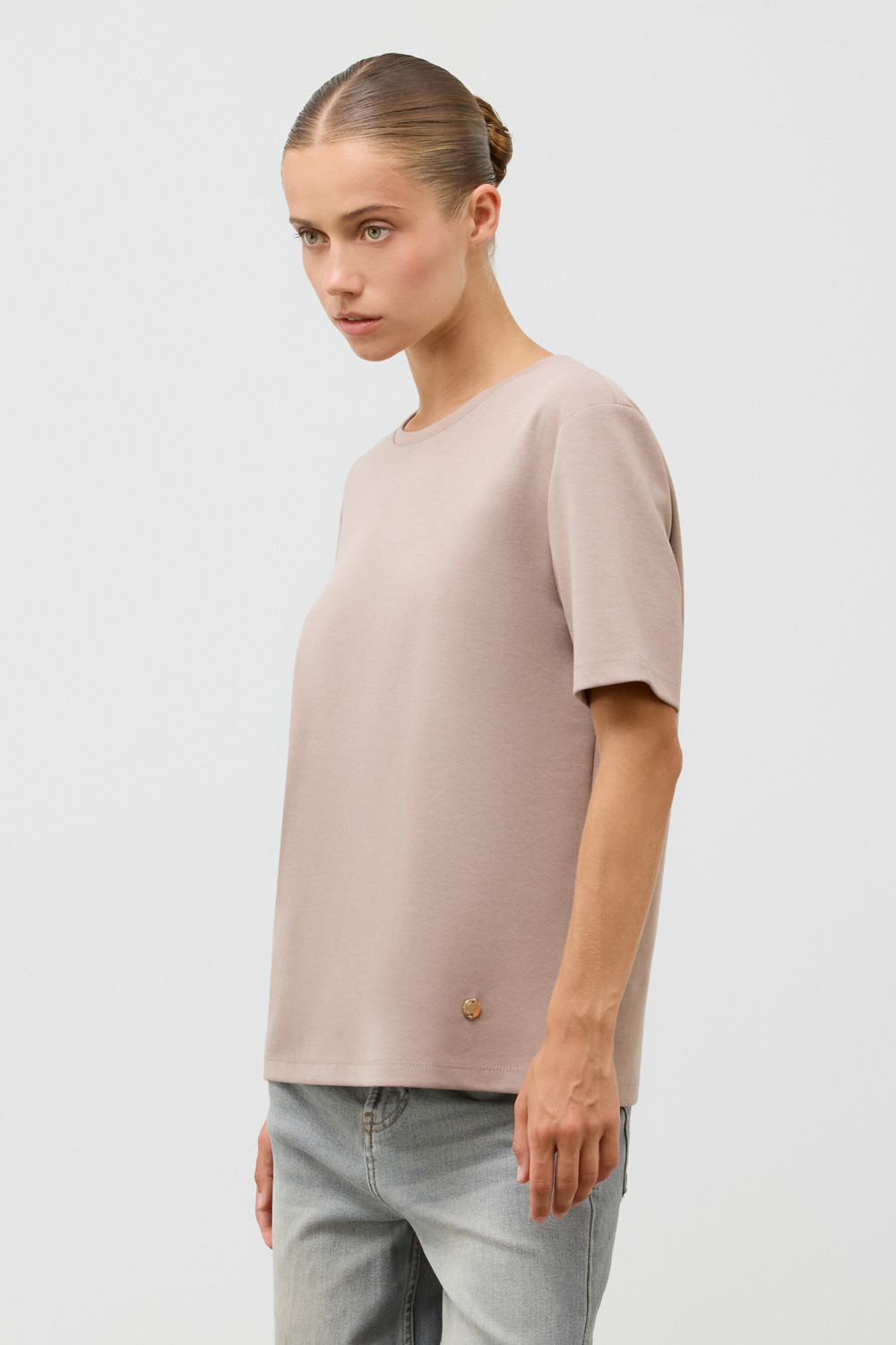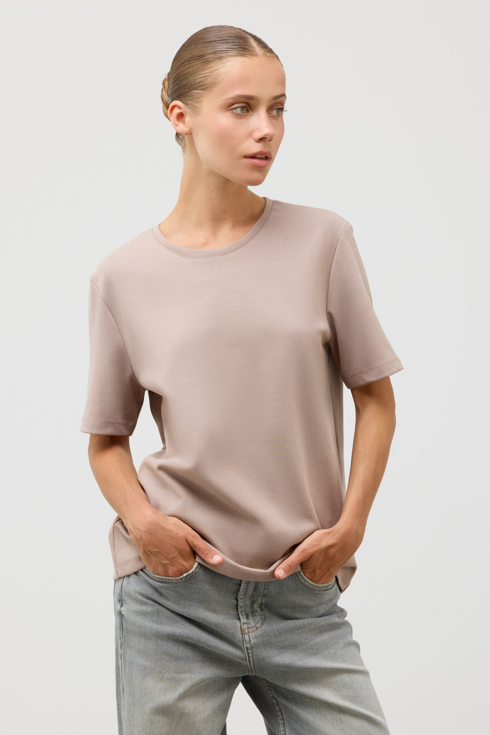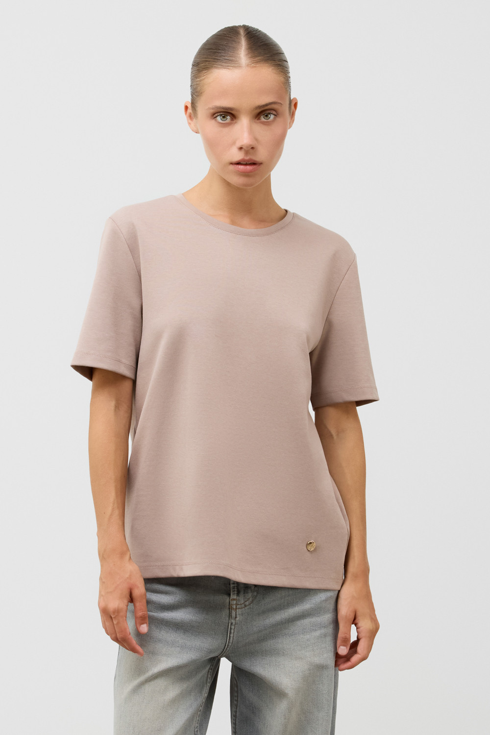 Базовая футболка из премиального трикотажа DOUBLE FACE.  Трикотаж прошел обработку силиконом, что придает ему легкость и шелковистость текстуры. Имеет классический круглый вырез и удобный прямой крой.