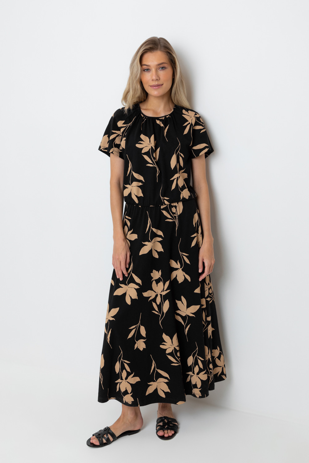 Легкое платье с круглым вырезом со сборками, короткими свободными рукавами из набивного трикотажа супрем. По спинке застежка на пуговицу и петельку. Пояс на мягкой резинке.                                                                                                                                                                 Все трикотажные полотна производятся в соответствии с нормами Швейцарского сертификата ЭкоТекс. Сделано в России