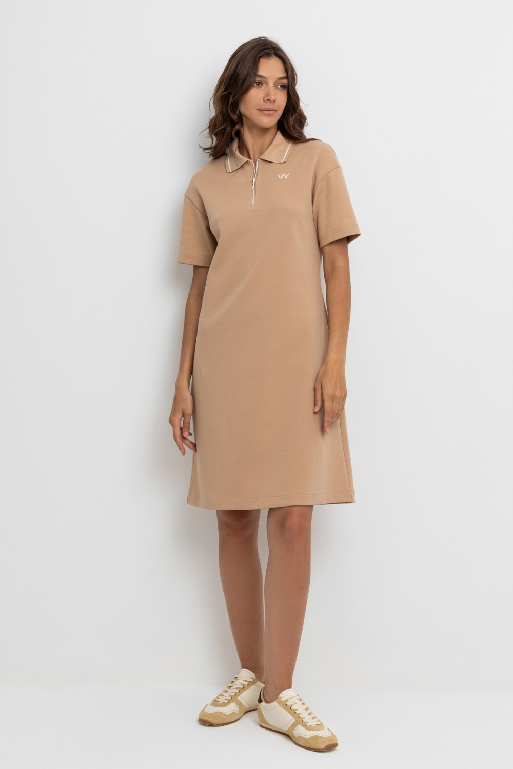 Платье поло с короткими рукавами из плотного гладкого трикотажа интерлок с застежкой на молнию. Спущенное плечо придает изделию свободный силуэт.