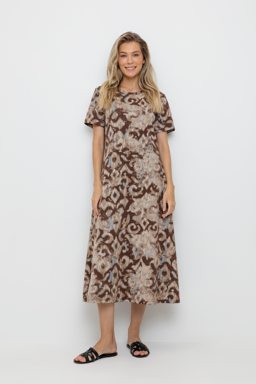 Платье с круглым вырезом и короткими рукавами из плотного набивного трикотажа интерлок. Модель с трапециевидной юбкой и боковыми карманами.