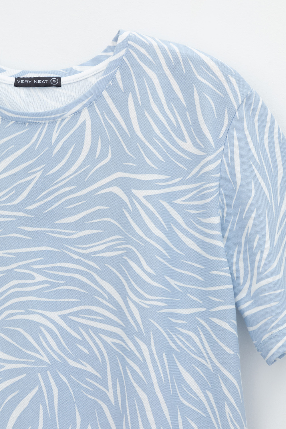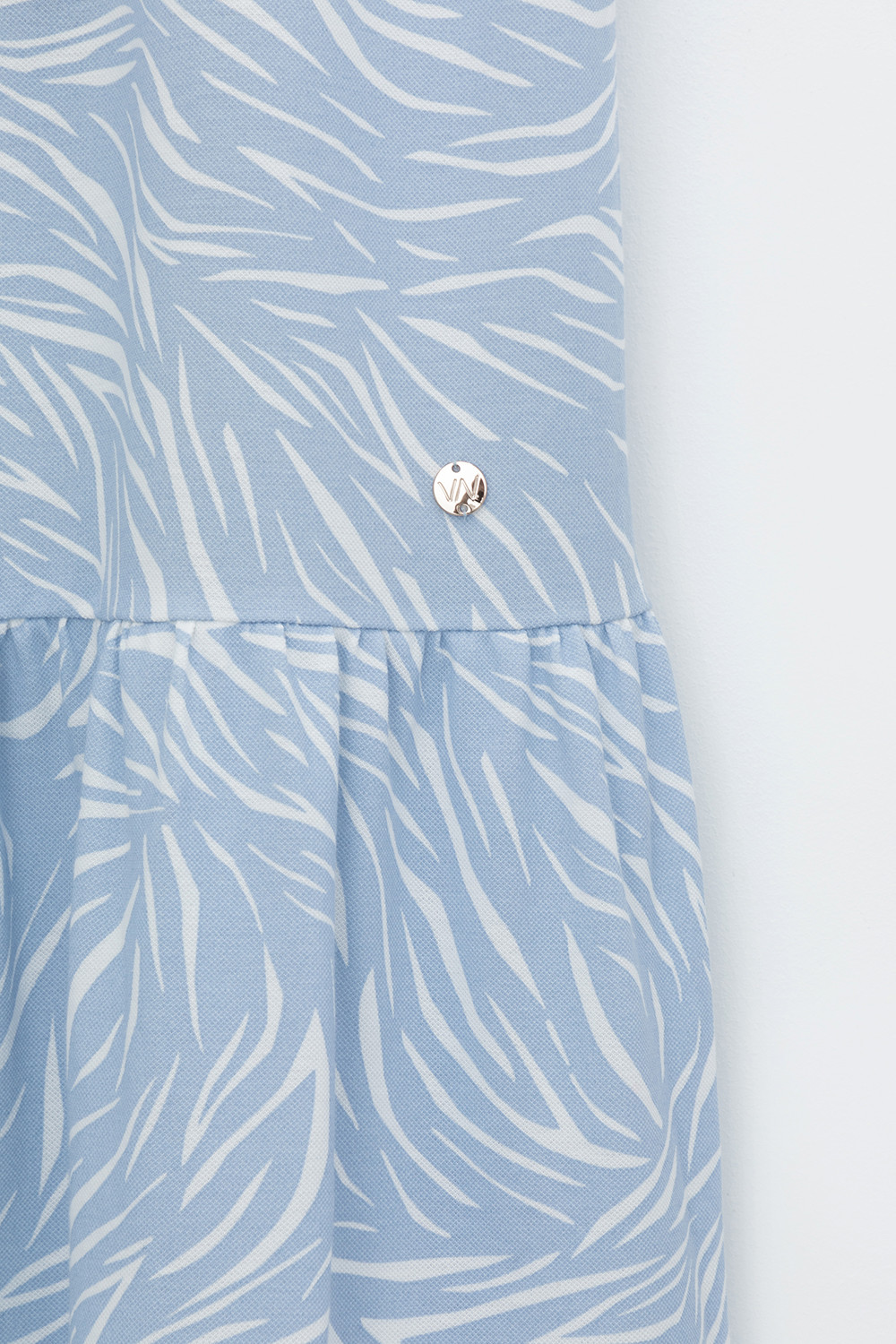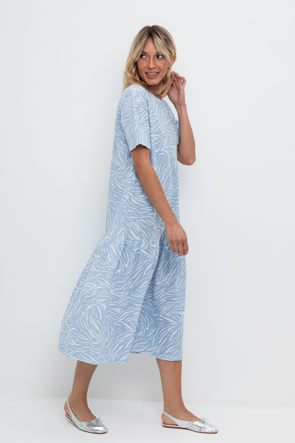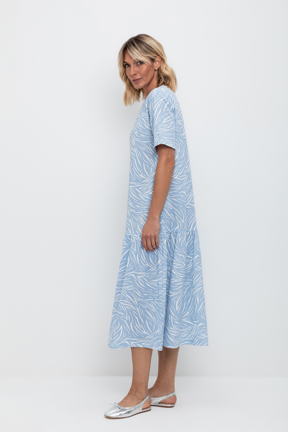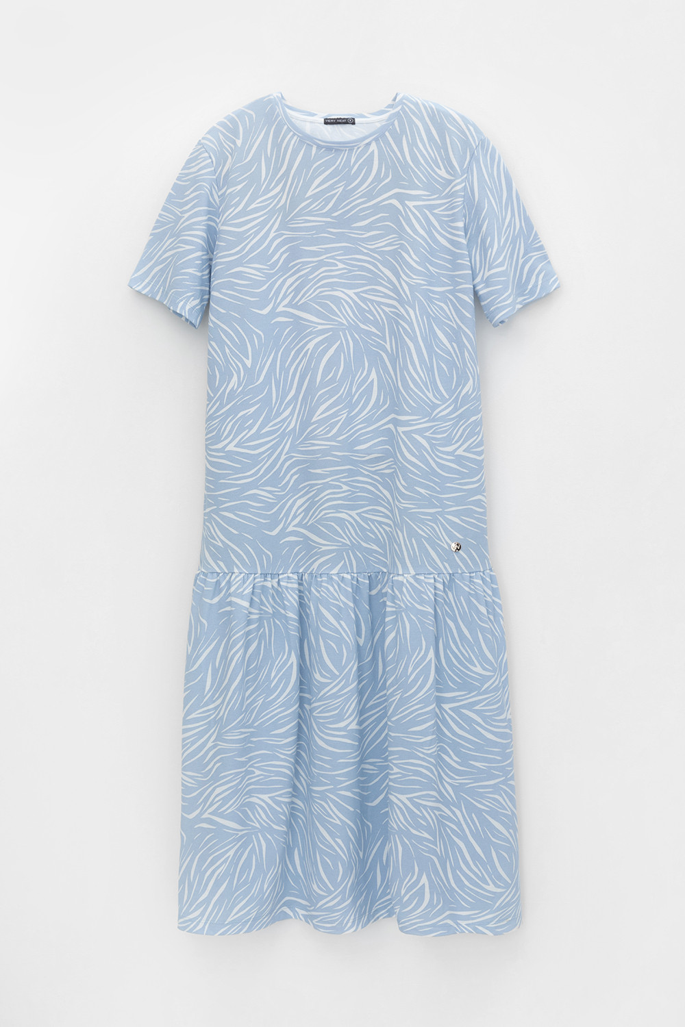 Трикотажное платье с воланом из набивного пике из длинноволокнистого гребенного хлопка. Спущенное плечо придает изделию свободный силуэт.